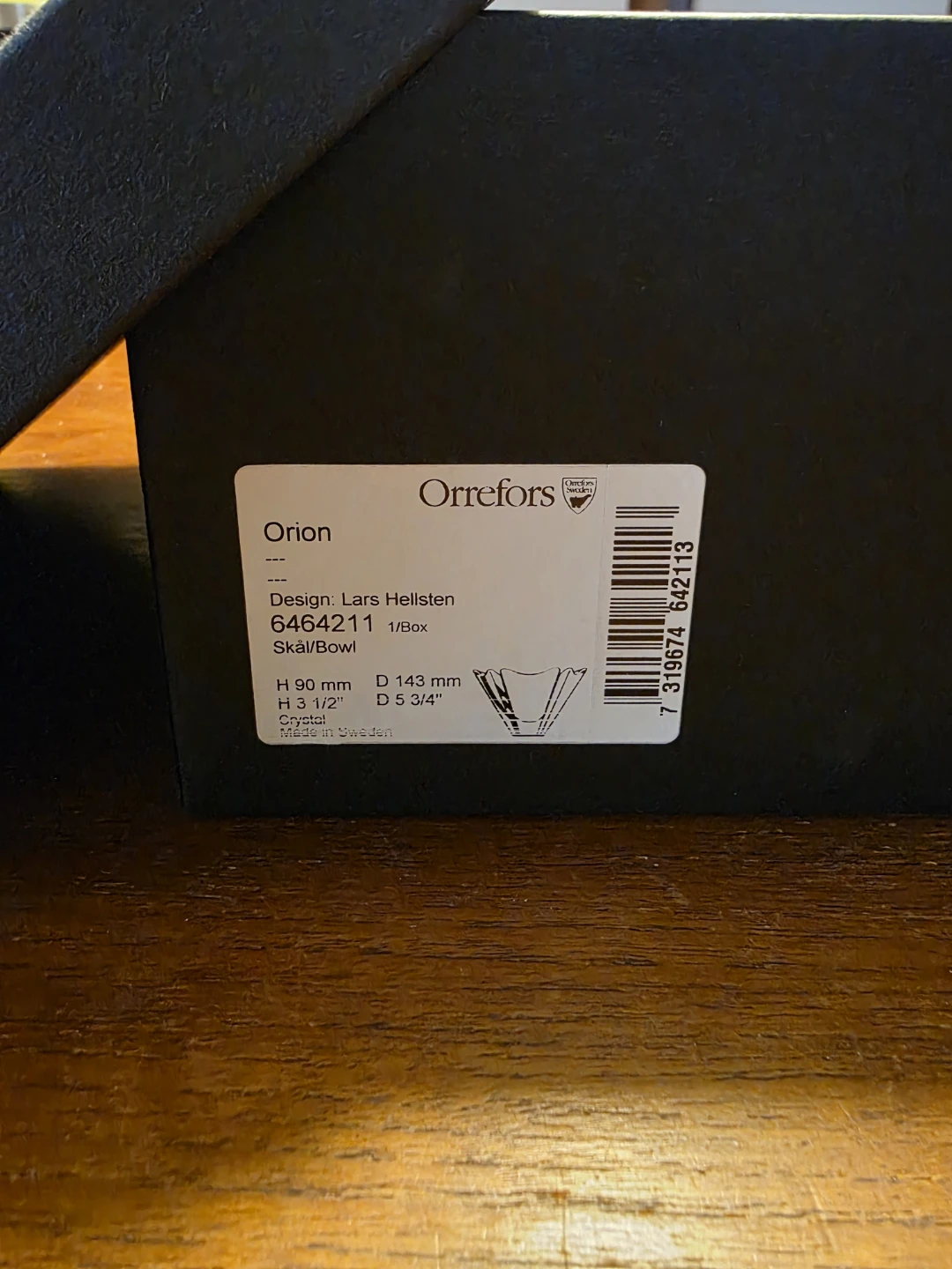 Beautiful Orrefors Orion crystal bowl, designed by Lars Hellsten and made in Sweden. This piece features Orrefors’ signature clear crystal with a sculptural, fluted form that reflects light beautifully. Elegant yet timeless—perfect as a decorative bowl, candy dish, or small centerpiece. Details: Brand: Orrefors Series: Orion Designer: Lars Hellsten Material: Crystal Made in Sweden Height: 9 cm / 3.5 in Diameter: 14.3 cm / 5.75 in Condition: Excellent condition, no chips or cracks. Original box included. A classic Scandinavian design piece—great for collectors or as a refined gift.