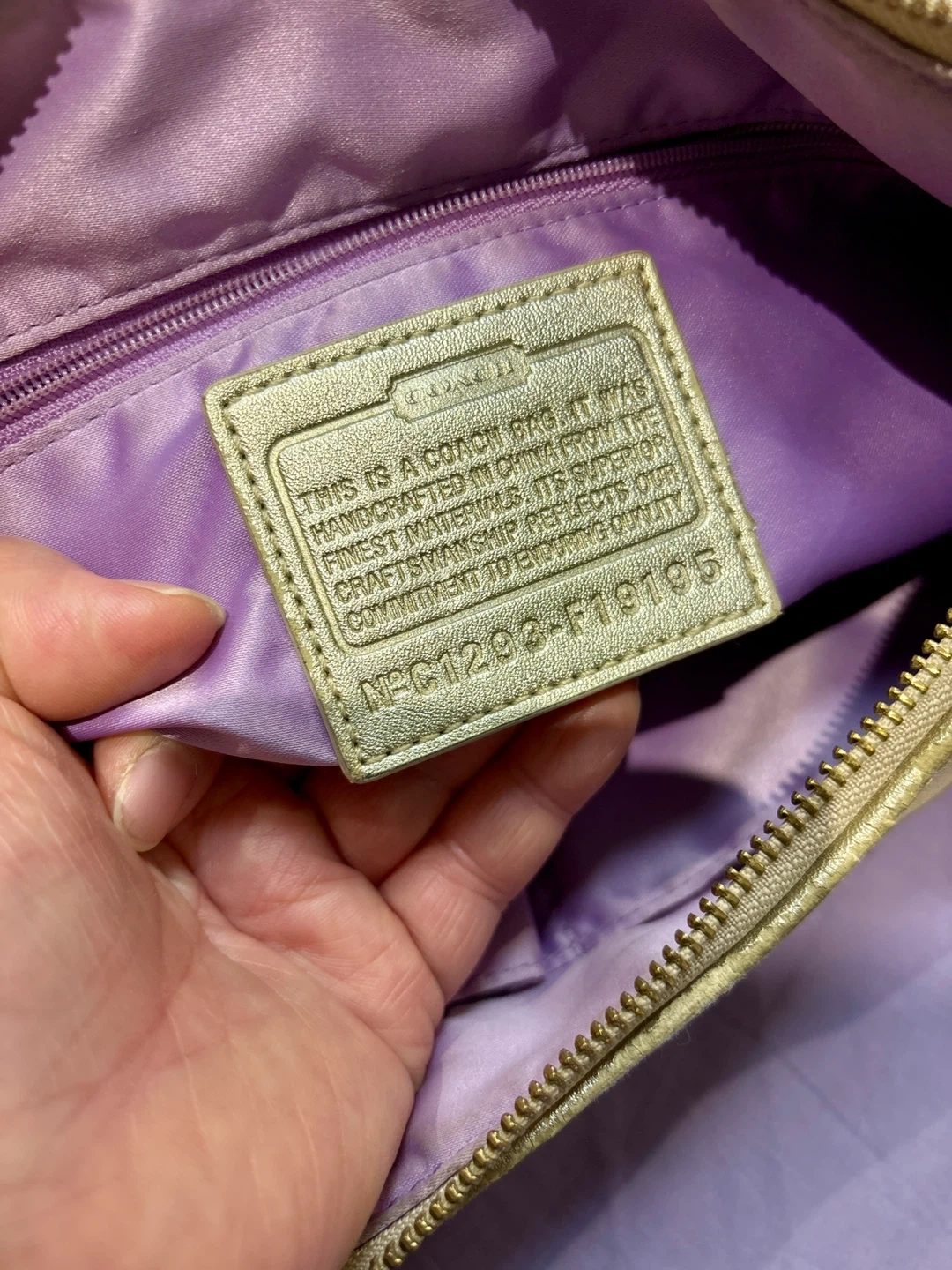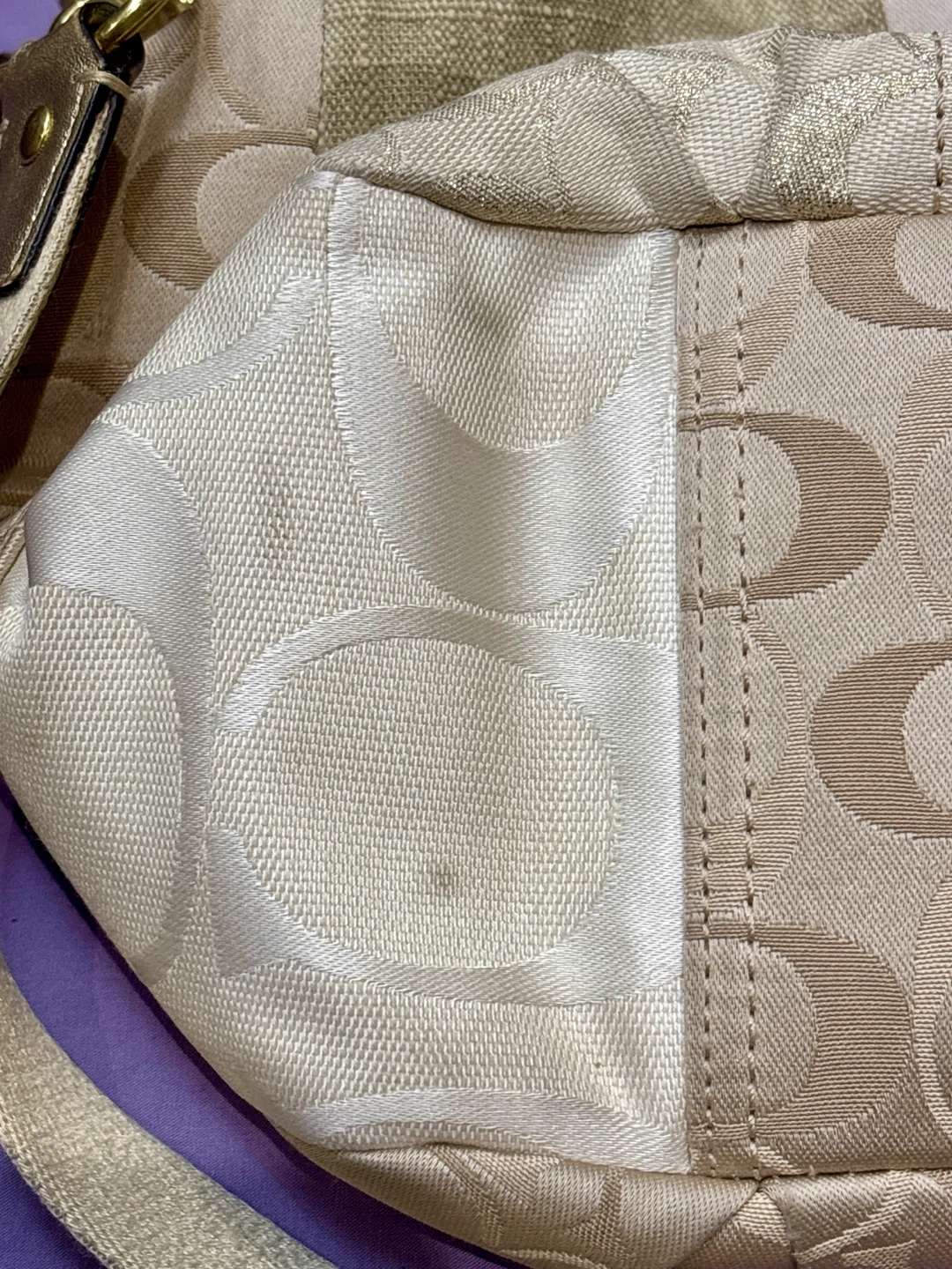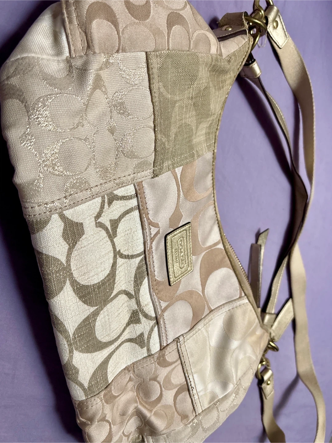 Selling a Coach patchwork hobo bag. The model number is F19195. It has a zipper closure and a shoulder strap. There is a small stain at the bottom of the bag and show some signs of wear.
