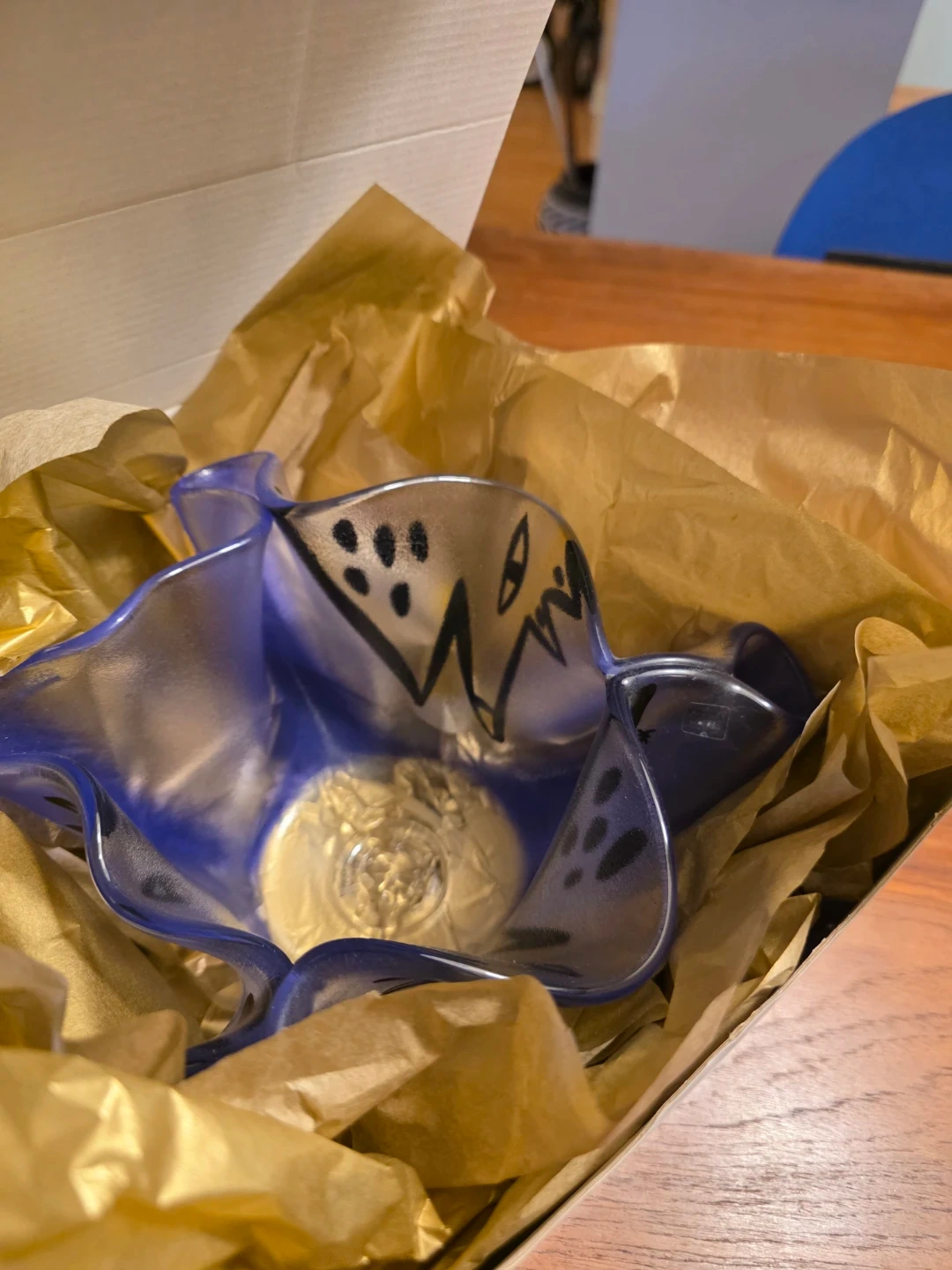 This sculptural piece features soft frosted blue glass with hand-painted black details and an organic, flowing form. When light passes through, it creates a beautiful glow—perfect as a statement art piece even without flowers.
