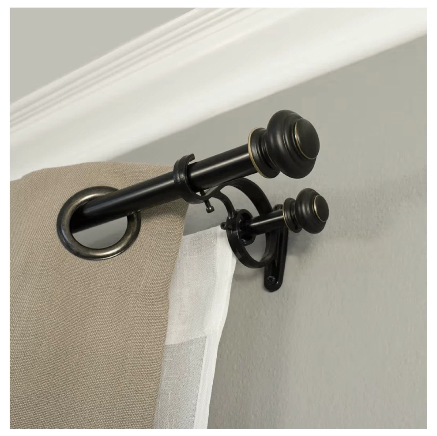 Selling a double curtain rod in black. It comes with all the necessary hardware and brackets for easy installation. Perfect for adding a touch of elegance to any room!
