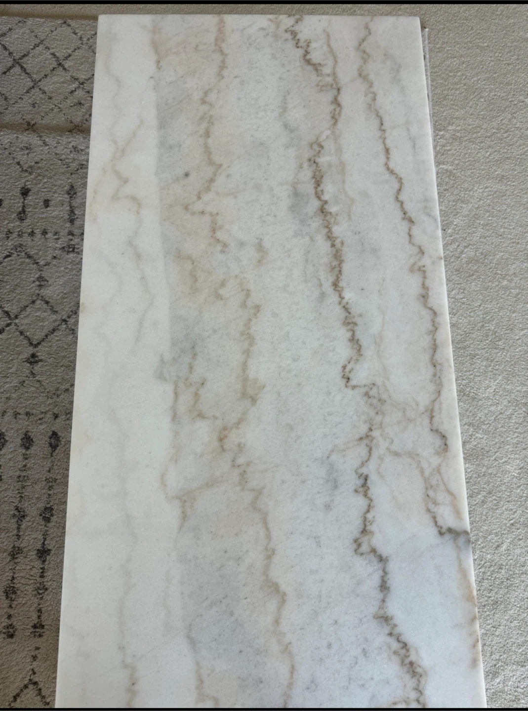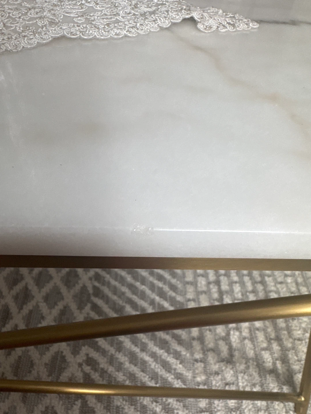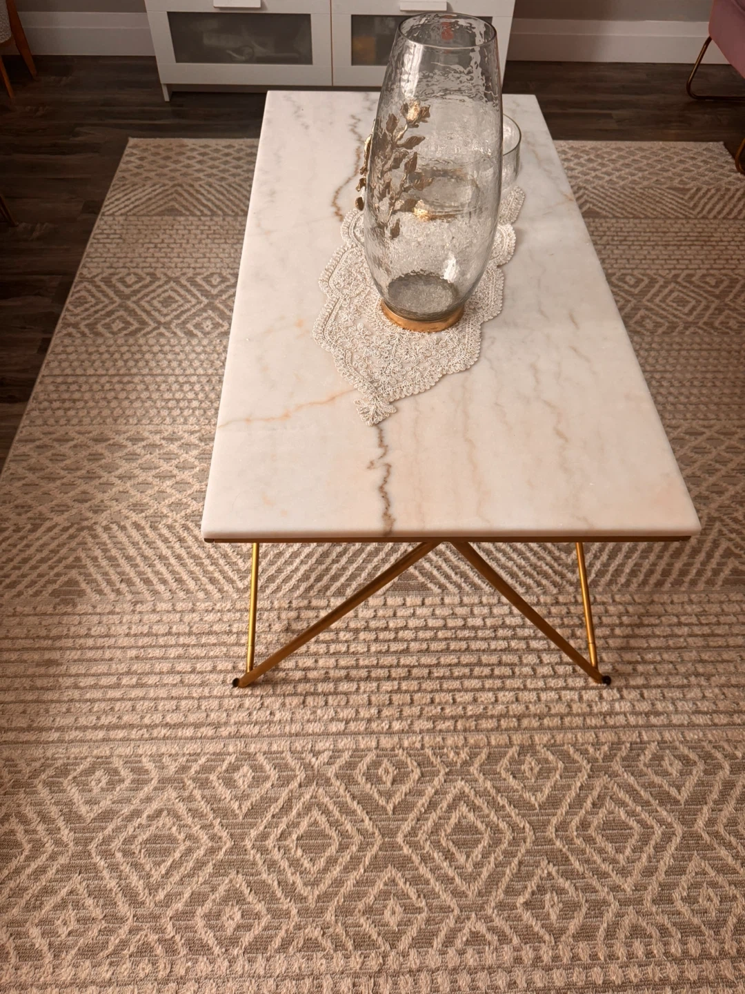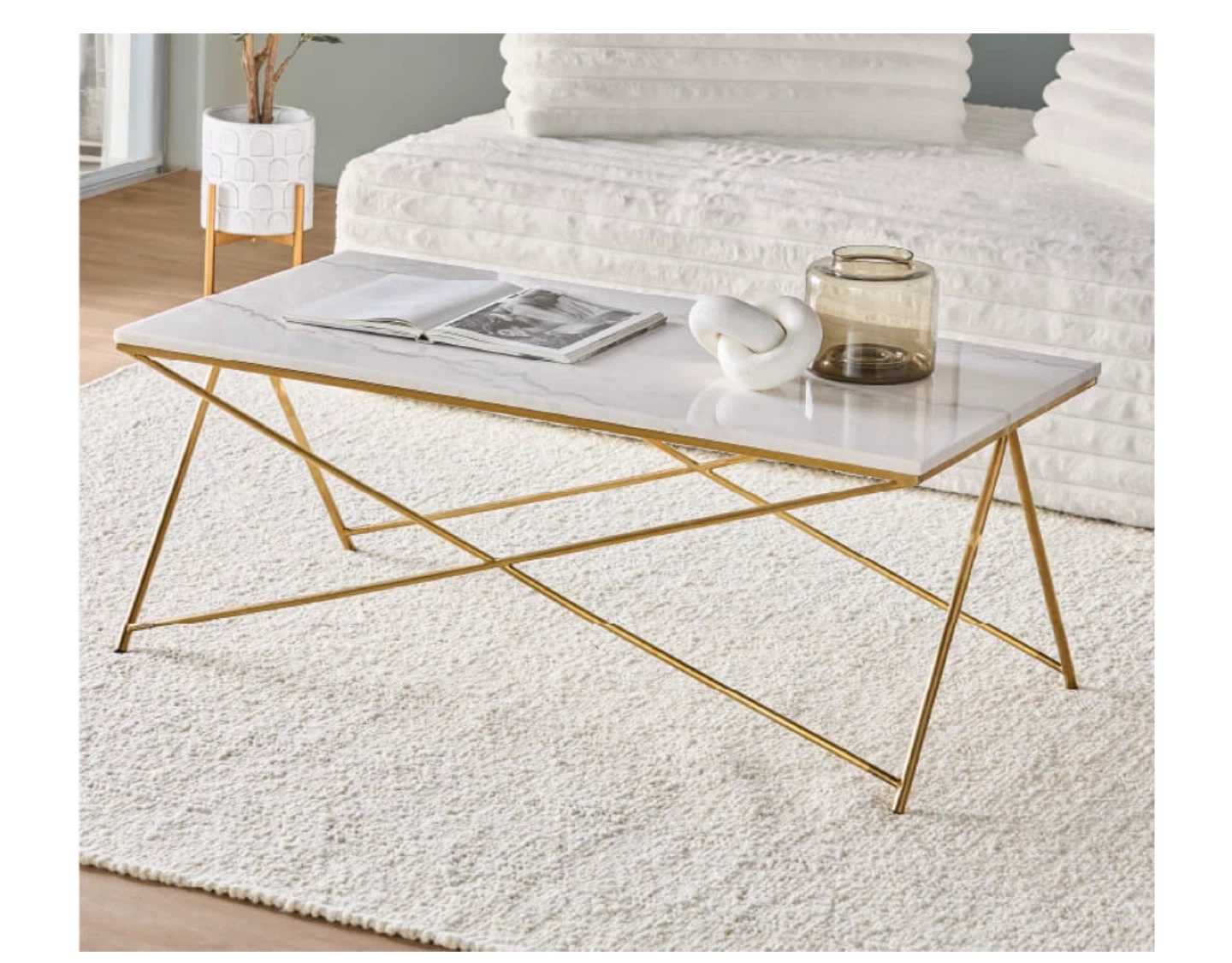 Here's a stylish coffee table with a marble top and gold-coloured metal legs! It's in great shape and would look lovely in any living room.