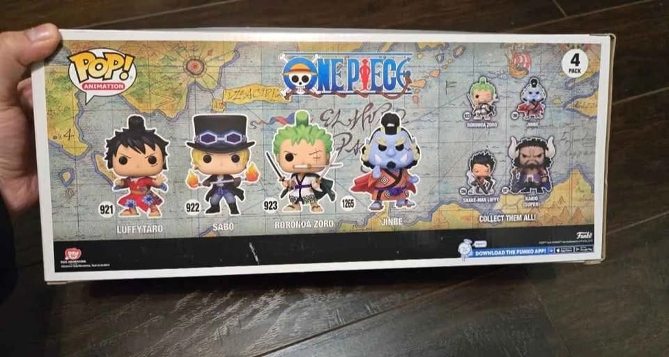 New, sealed Funko Pop! Animation 4-pack featuring Luffy, Sabo, Zoro, and Jinbe. Collectible figures from the popular anime One Piece. Great for collectors or fans.