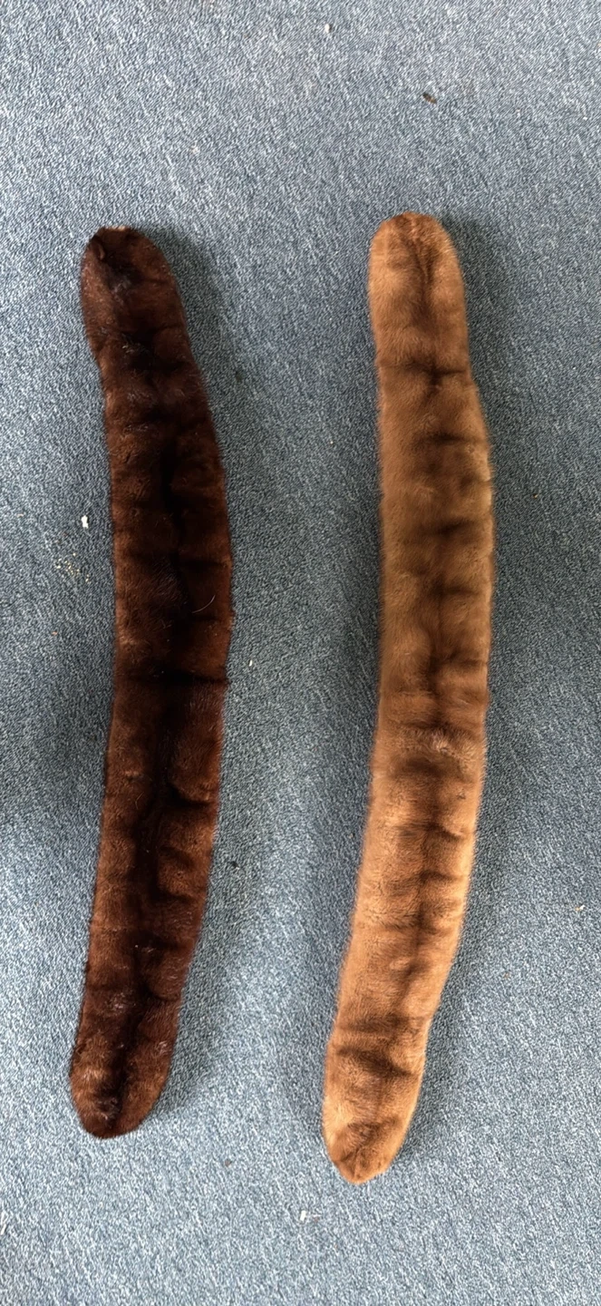 Selling two fur stoles, one in a rich brown and the other in a lighter brown shade. They're in good condition and ready to add a touch of vintage elegance to your wardrobe! The dark one is 39” and the light one is 44”