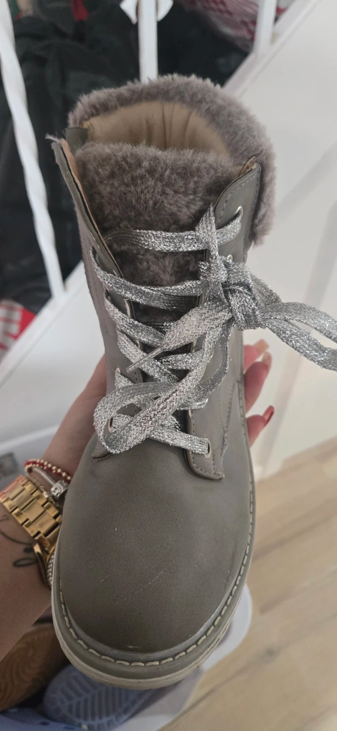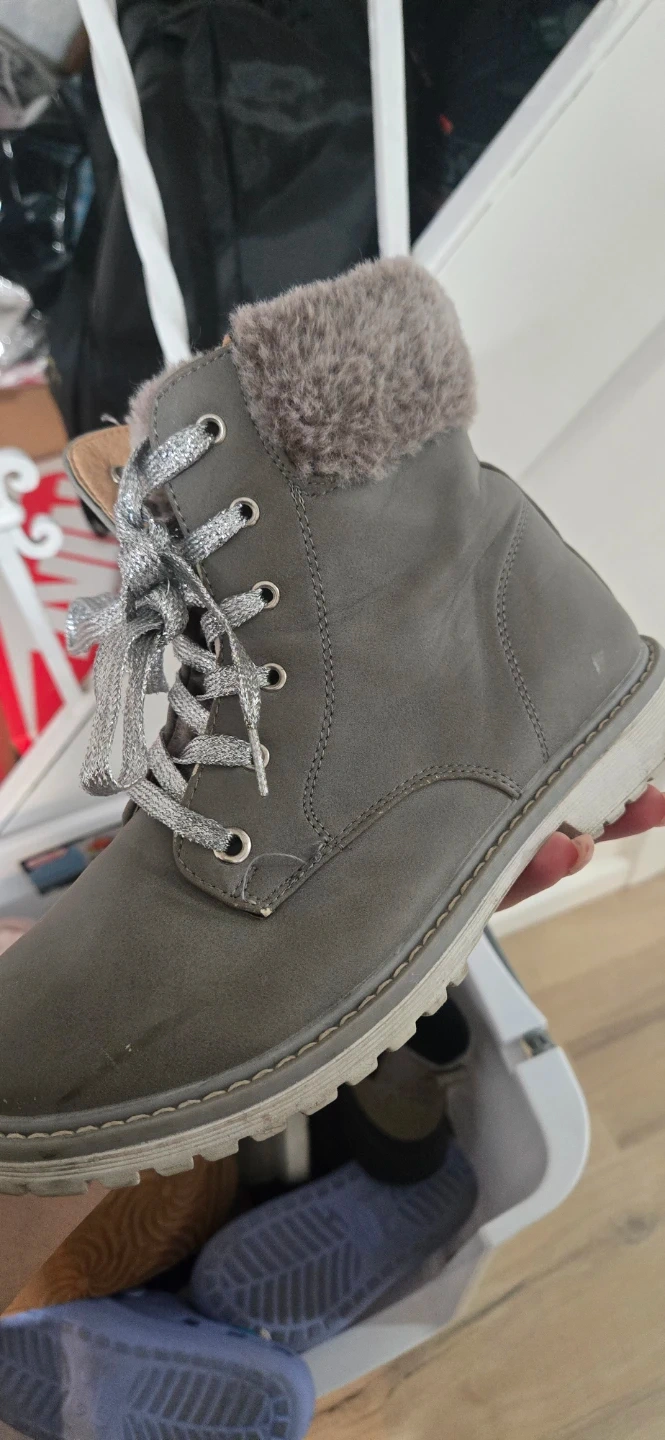I'm selling a pair of gray winter boots with a cute fur trim. They show some signs of wear, but they're still very warm and comfortable for the cold weather!