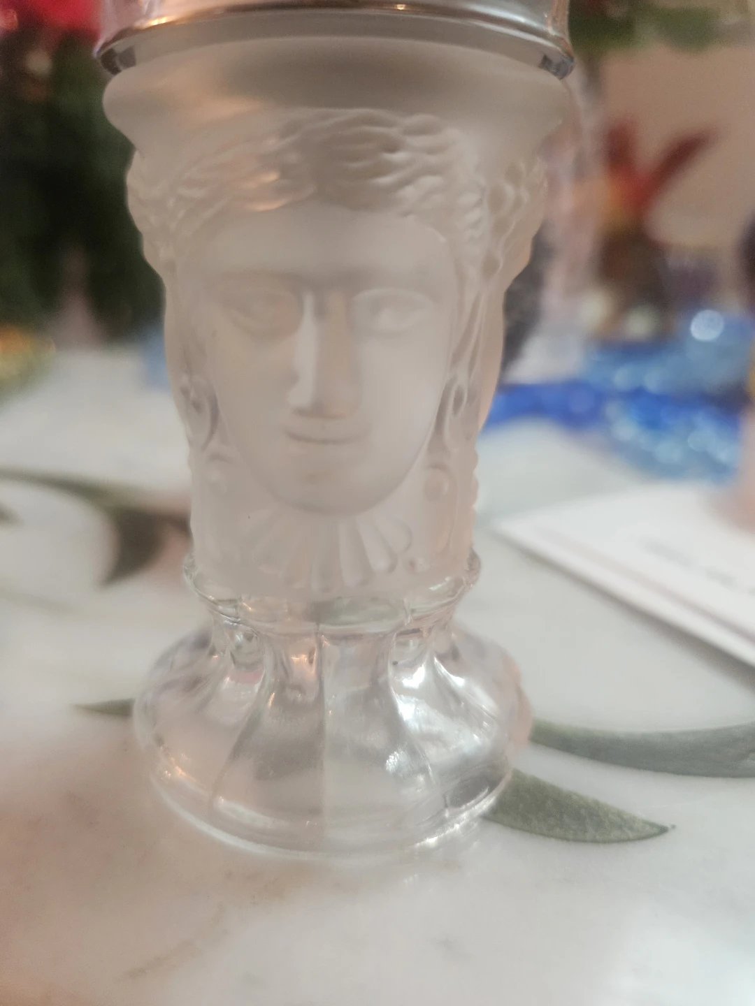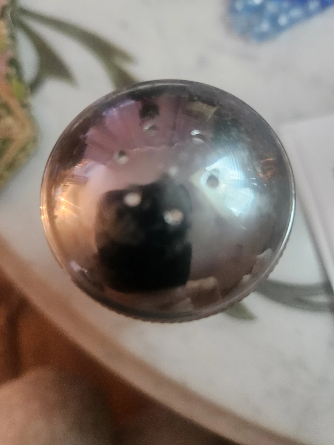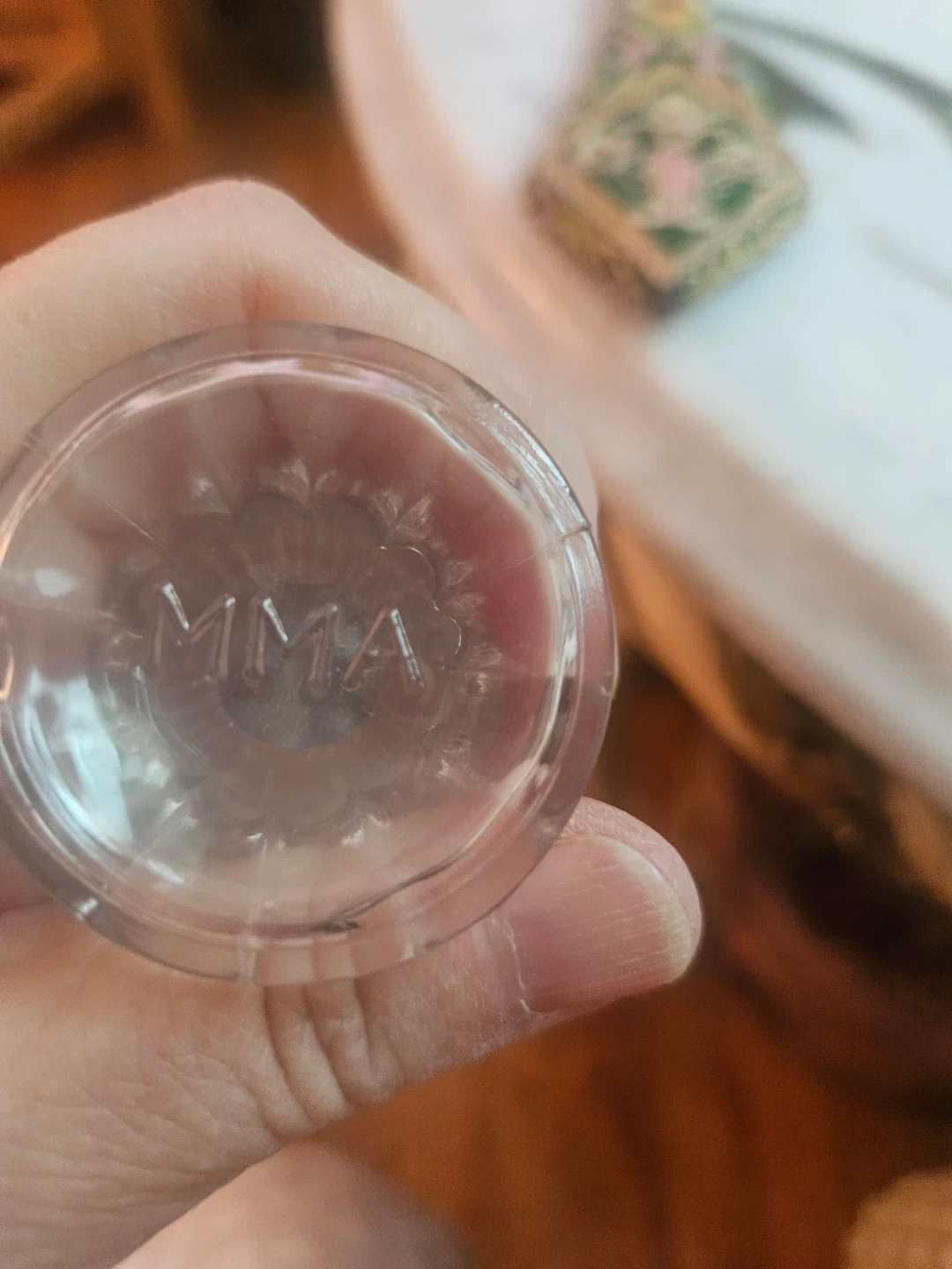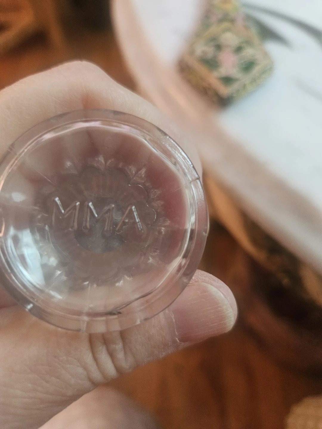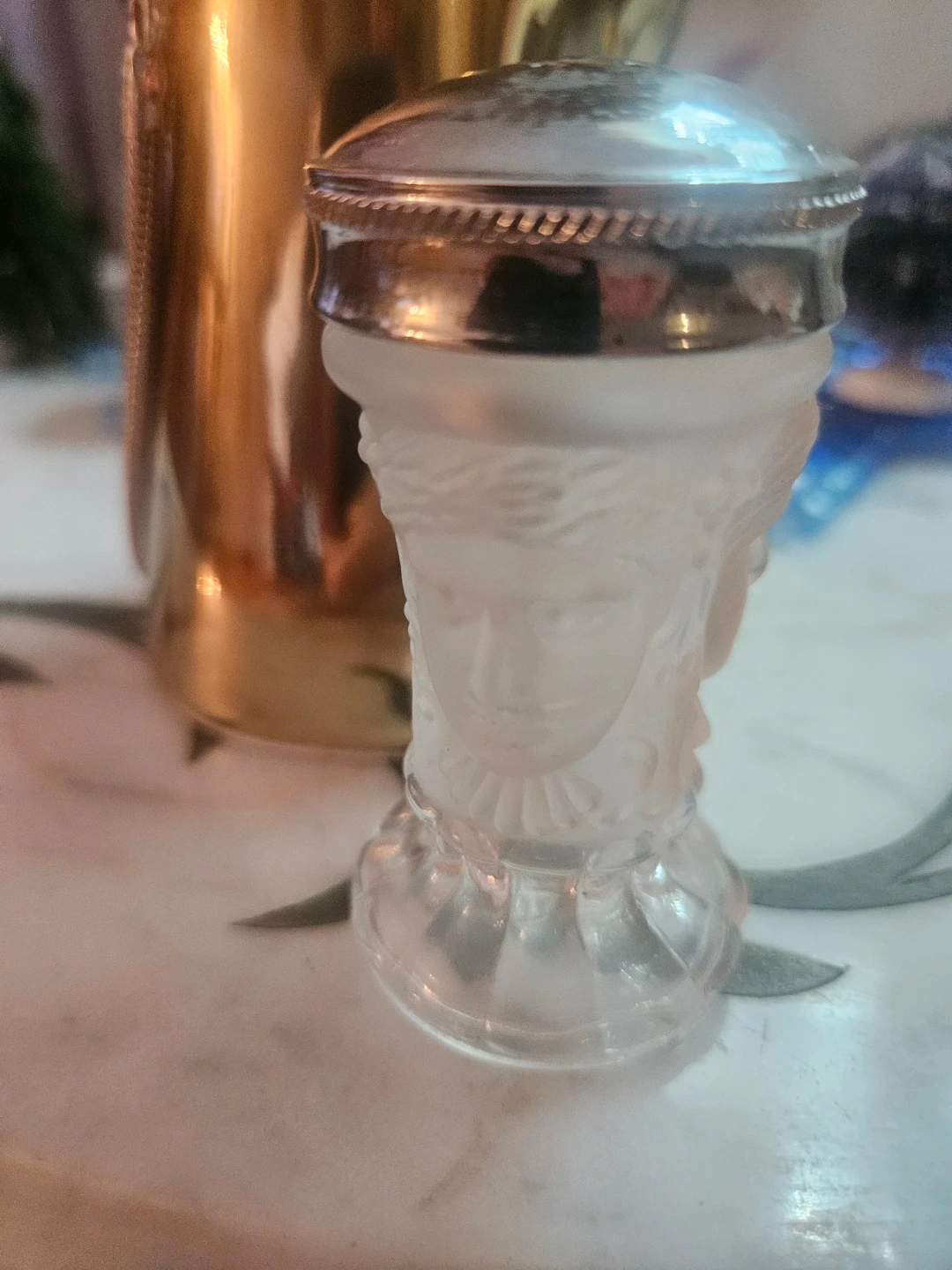 Selling a vintage salt shaker with a unique design! It features a frosted glass body with a face design and a metal top. The bottom has the MMA logo.