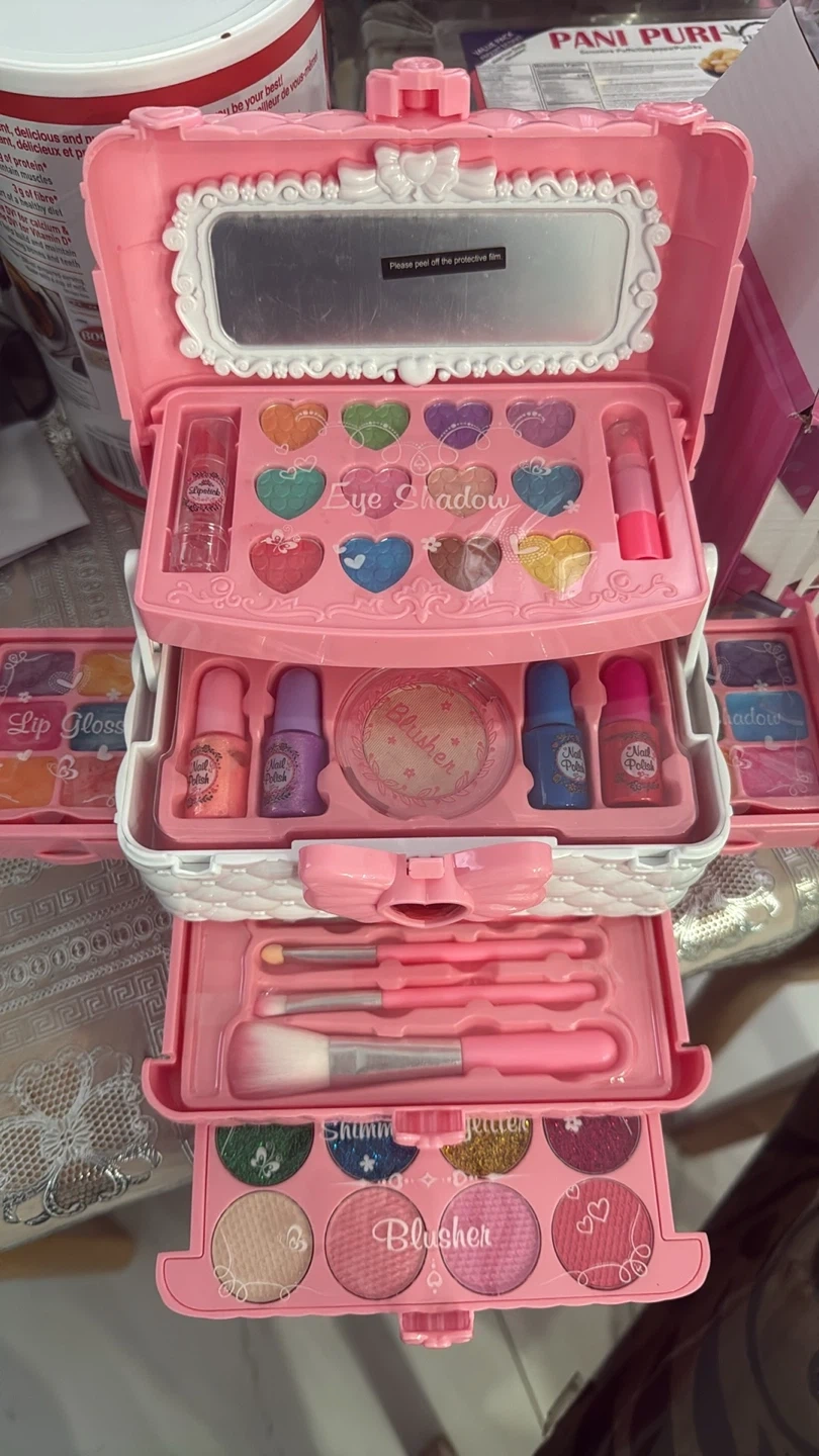 This adorable pink makeup kit is perfect for pretend play! It includes eye shadow, lip gloss, nail polish, blusher, and brushes. It's a great way for kids to explore their creativity and have fun. Please peel off the protective film on the mirror before use