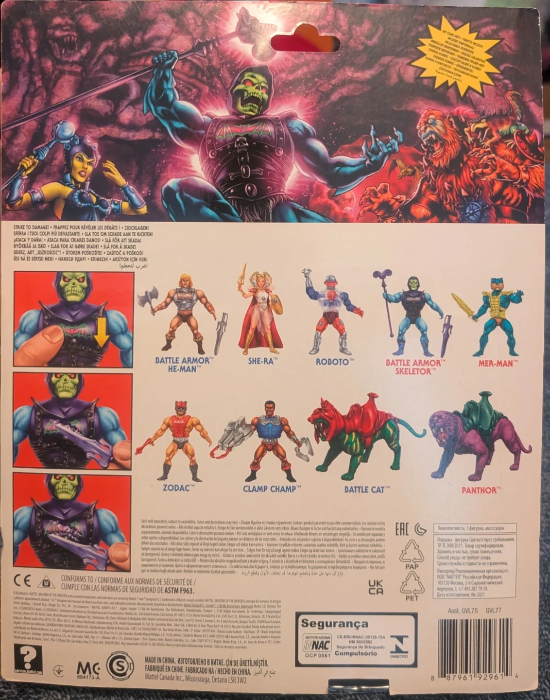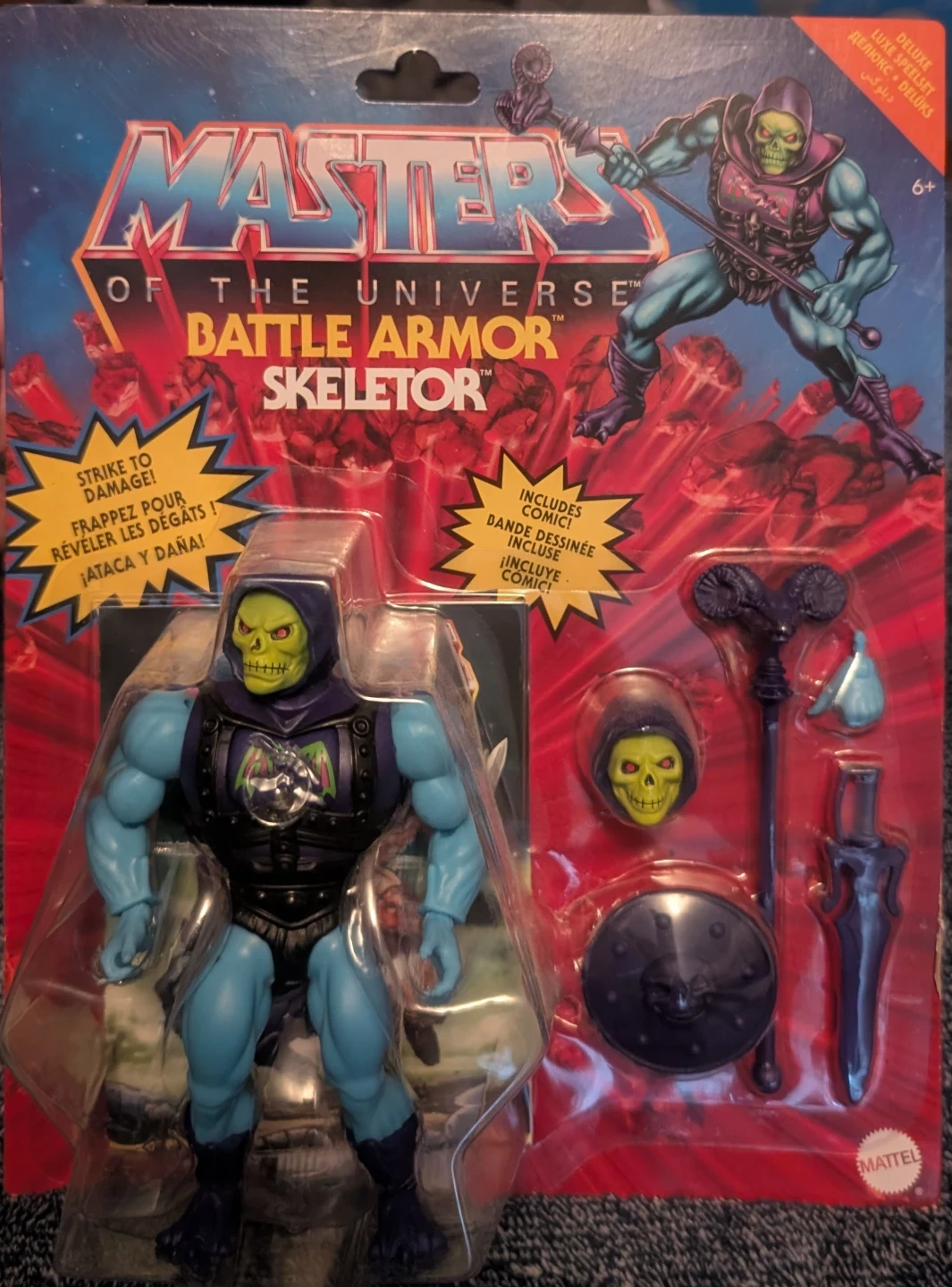 💥SEALED ON CARD💥 Selling a Masters of the Universe Battle Armor Skeletor action figure! It's a reissue from 2022. It includes a mini comic and comes with accessories like a 2nd expression head, secondary weapon left hand, staff, shield, and sword. A cool addition to any collection!
