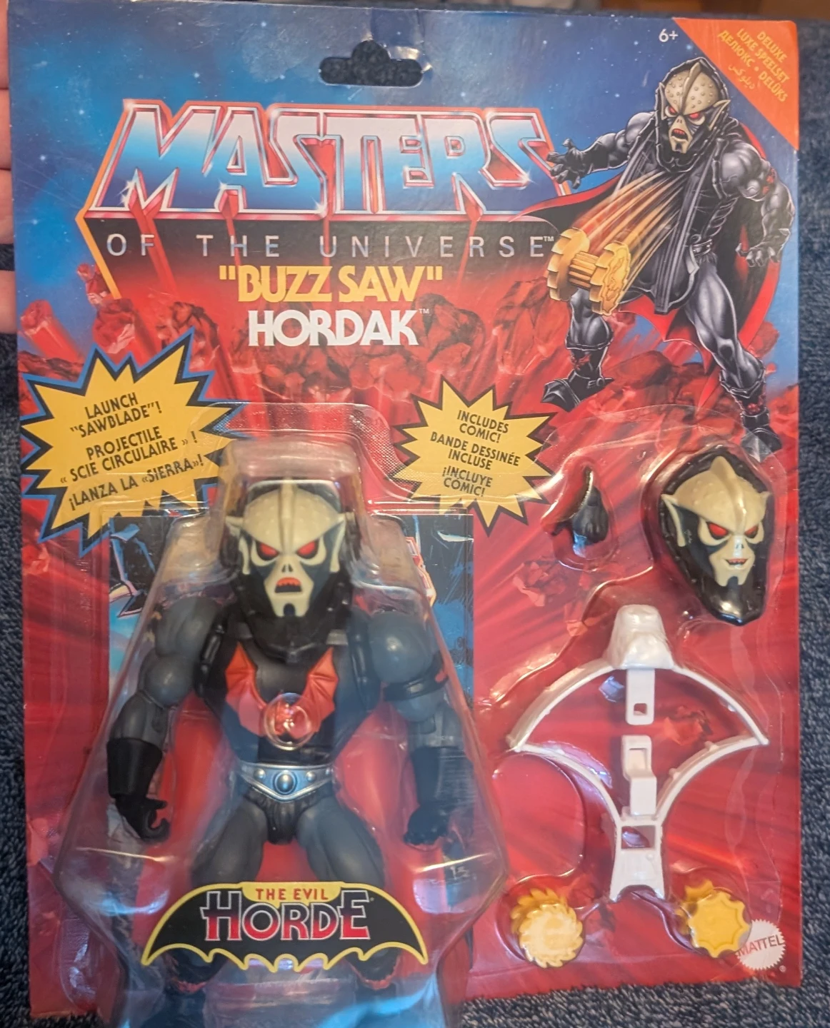 💥Sealed On Card💥 Selling a Masters of the Universe "Buzz Saw" Hordak action figure. It's a reissue from 2022. It's still brand new in the original packaging, Includes a mini comic book, 2nd expression head, secondary weapon left hand, crossbow & two different saw blade projectiles.