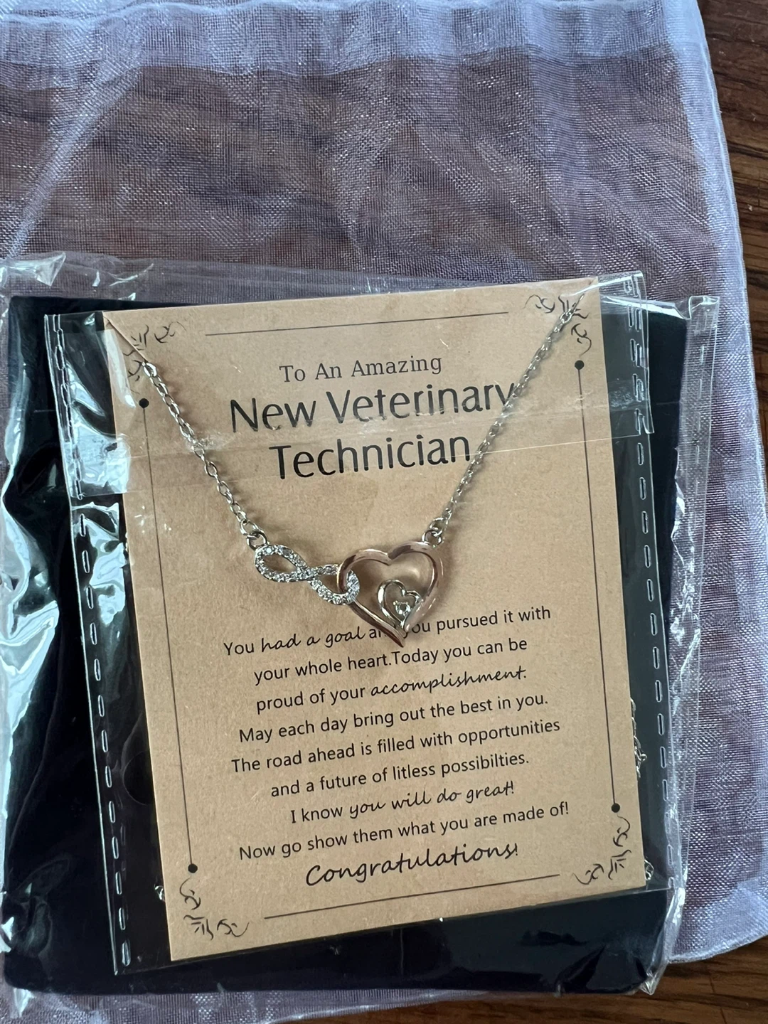 I'm selling a brand new necklace that says 'To An Amazing New Veterinary Technician'. It features an infinity symbol connected to a heart. It's a cute way to show appreciation for a vet tech! 12 mm, Stainless Steel