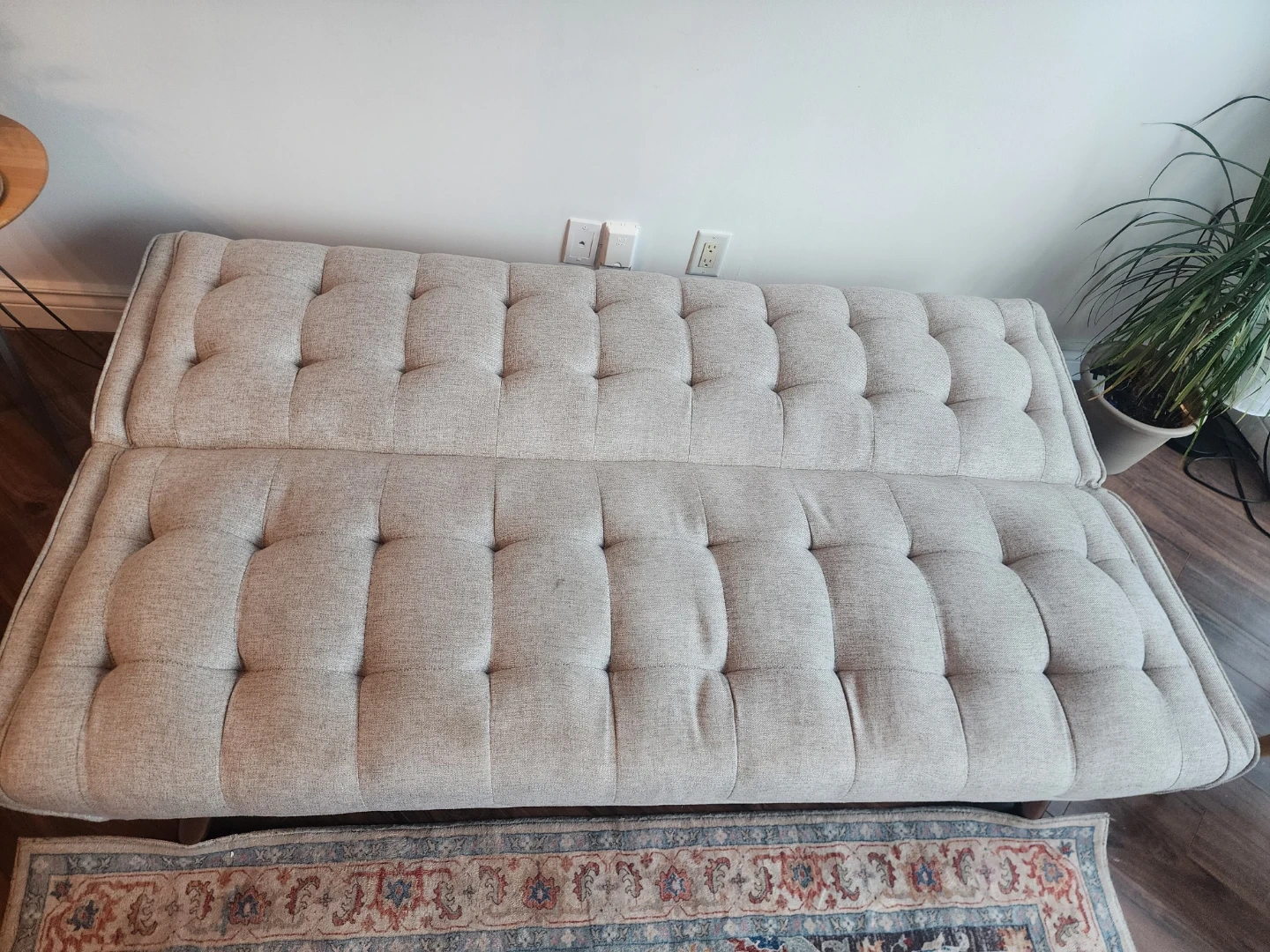 Selling a comfy grey tufted futon sofa bed from Structube. We are selling it because we want a sectional, otherwise there is no defect in the sofa. Its almost in new condition and will look great in any space! We dont have space and need it gone ASAP please. If you're interested, please reach out.