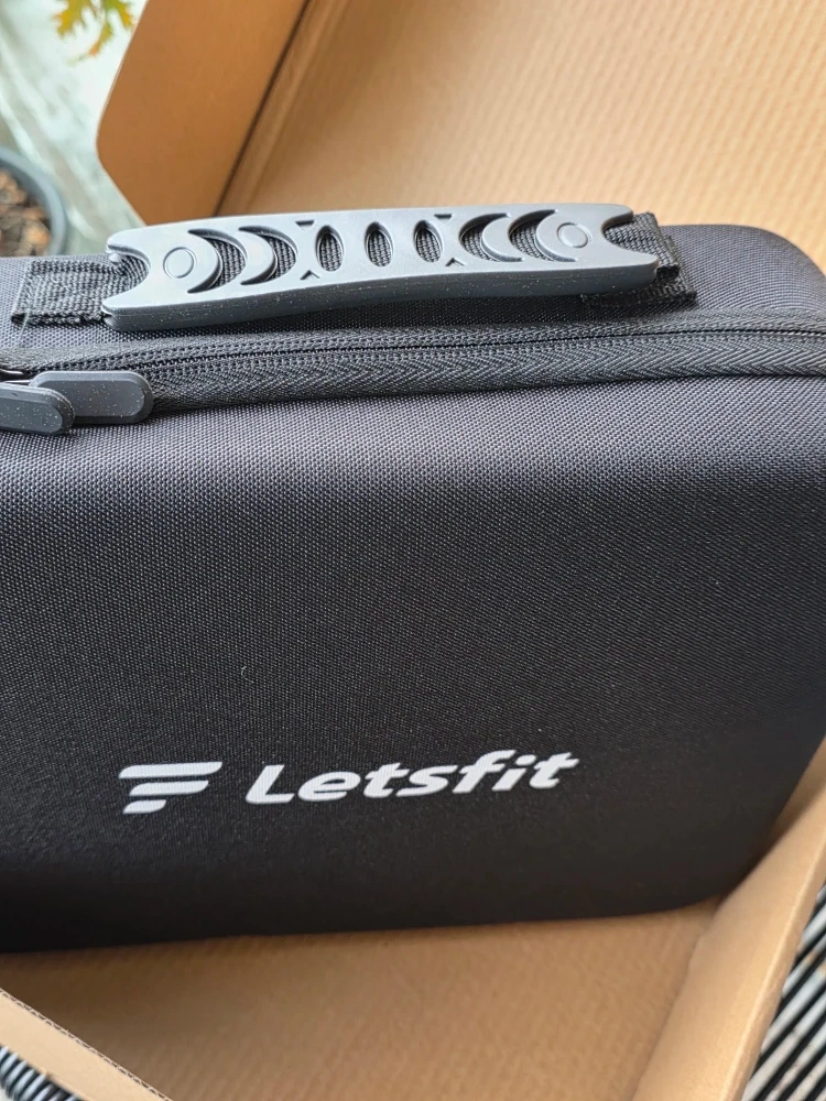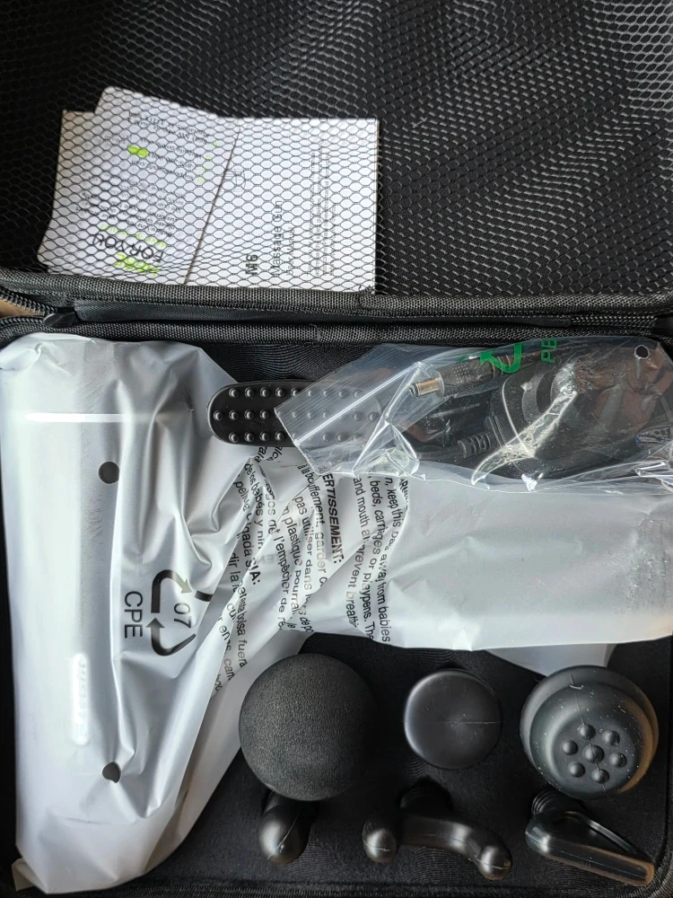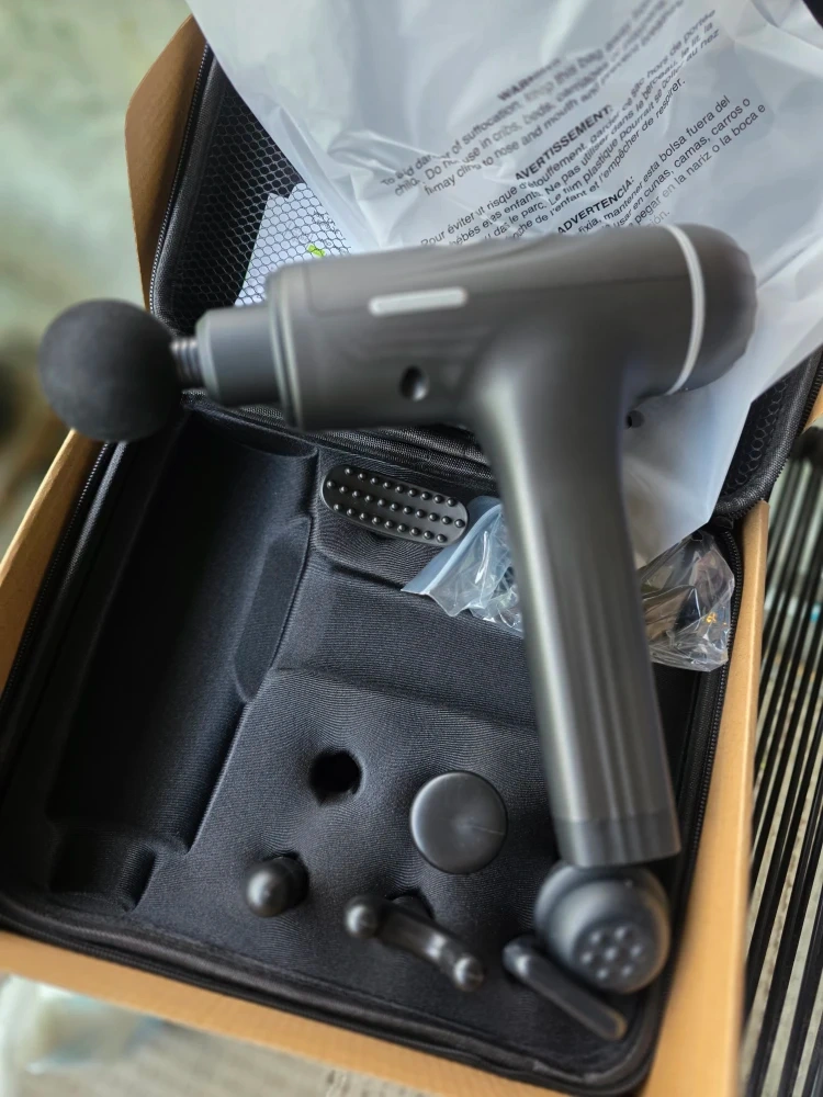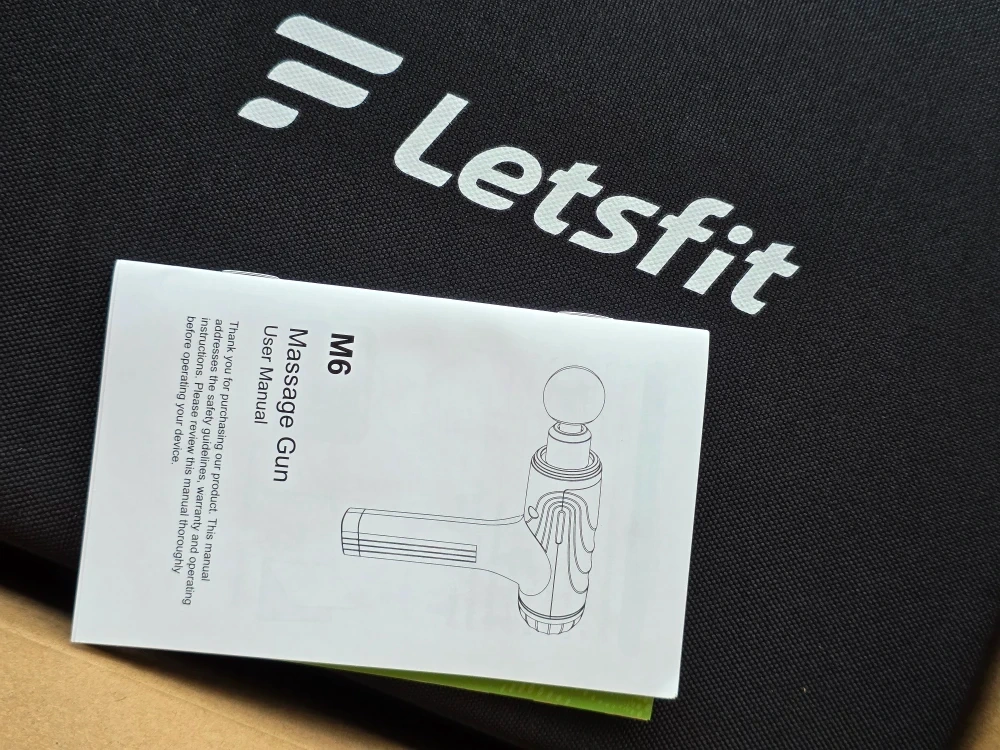 I'm selling a Letsfit M6 massage gun. It comes with the box and various components, including different massage heads and a charger. It's in great condition and ready to help you relax those muscles!