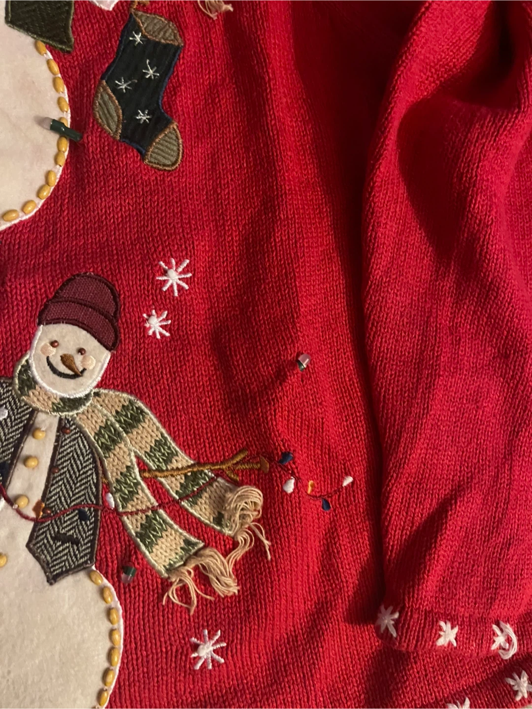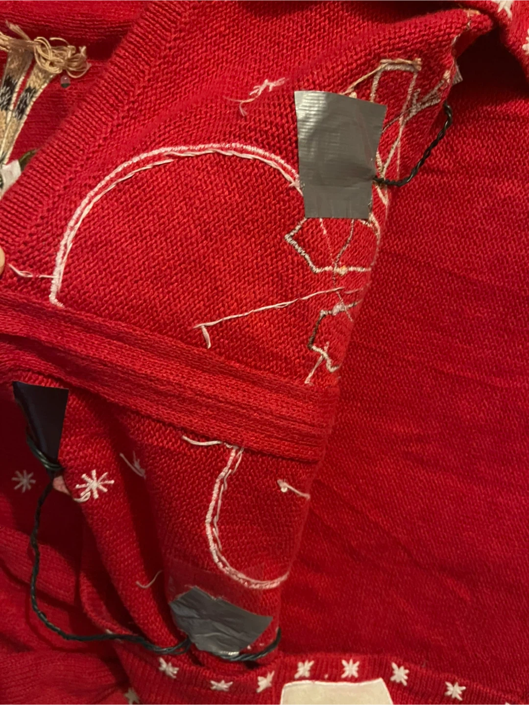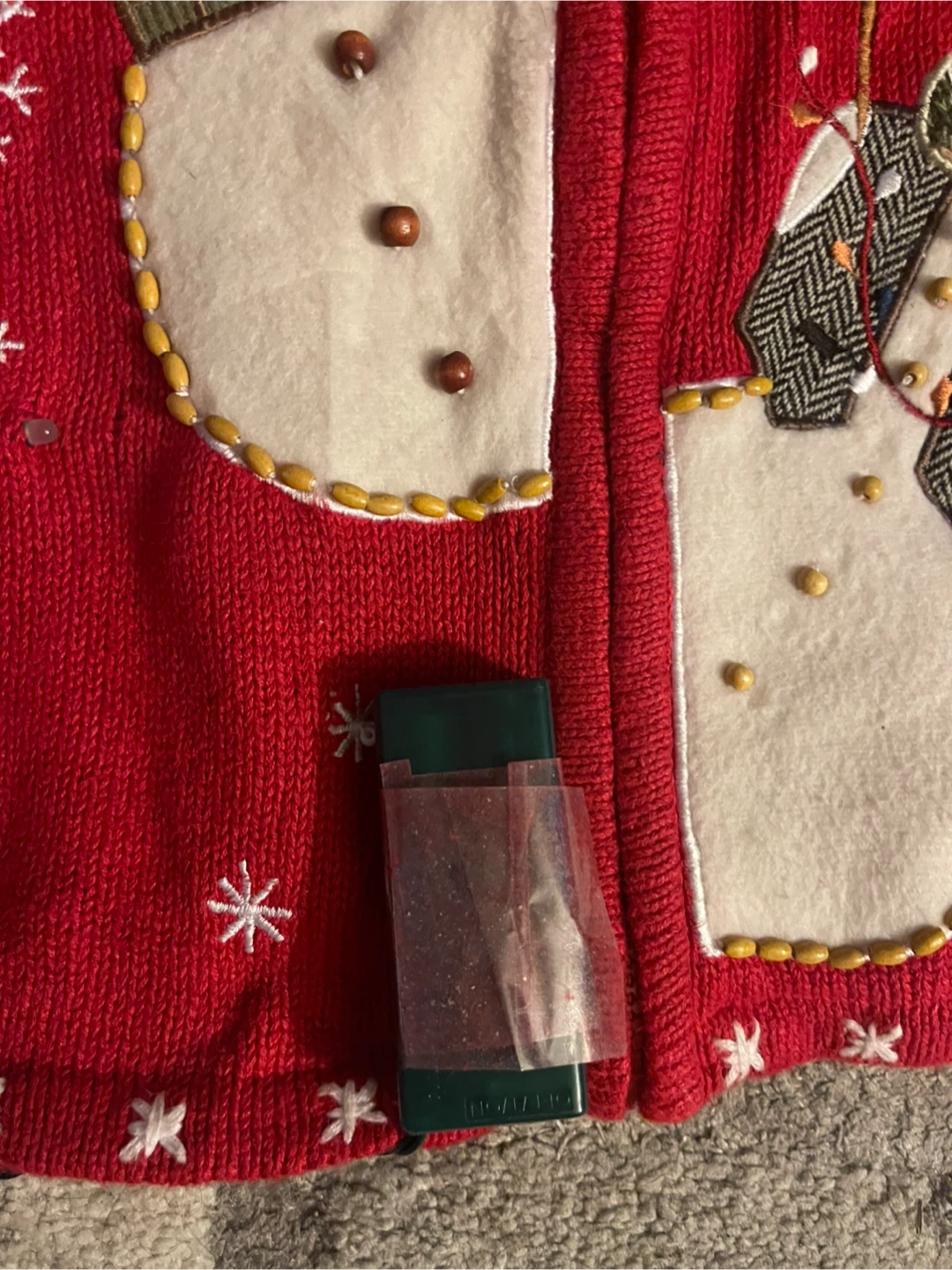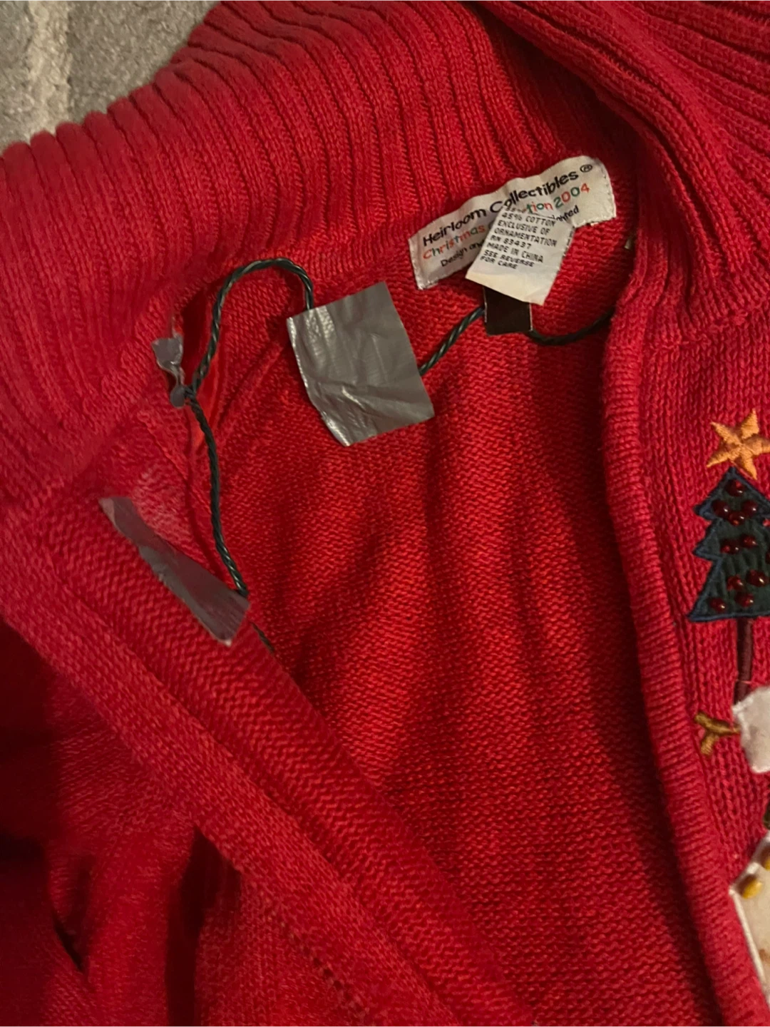 This is a cute red cardigan from Heirloom Collectibles, Christmas Edition 2004. It's a festive piece with a unique design!