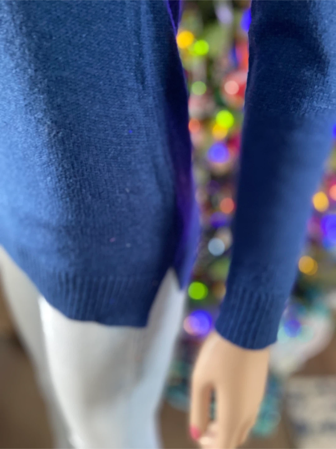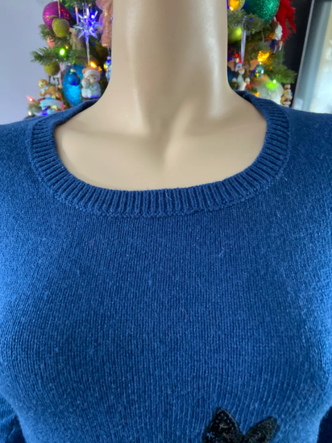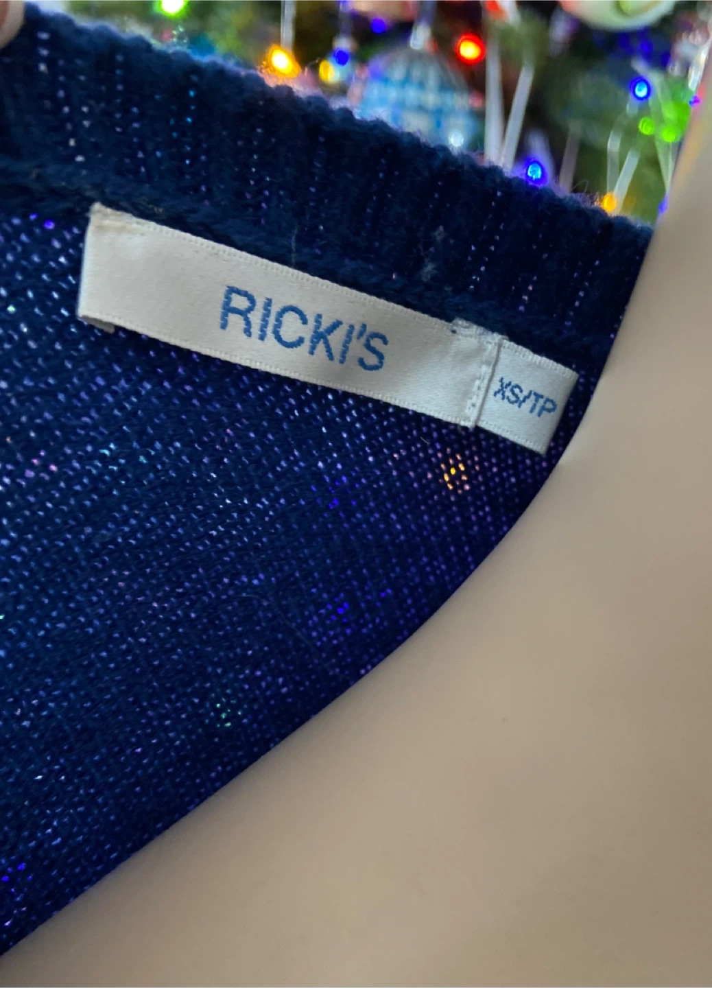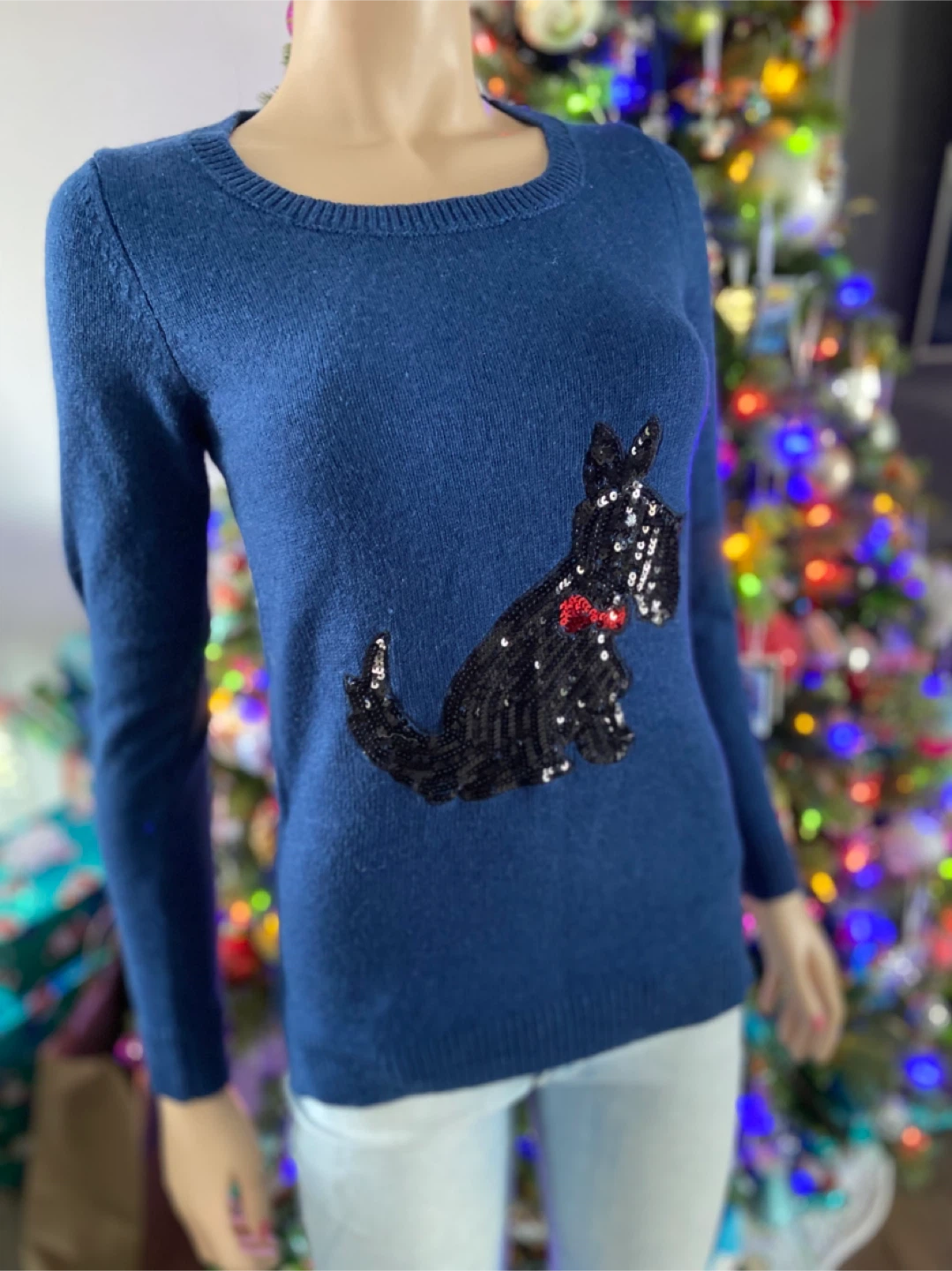 A cute blue Ricki’s sweater with a Scottie dog design made of sequins. It's in excellent condition, only worn once and smk-free. Perfect for the Christmas holiday season! Size XS. Pick up north end St Catharines