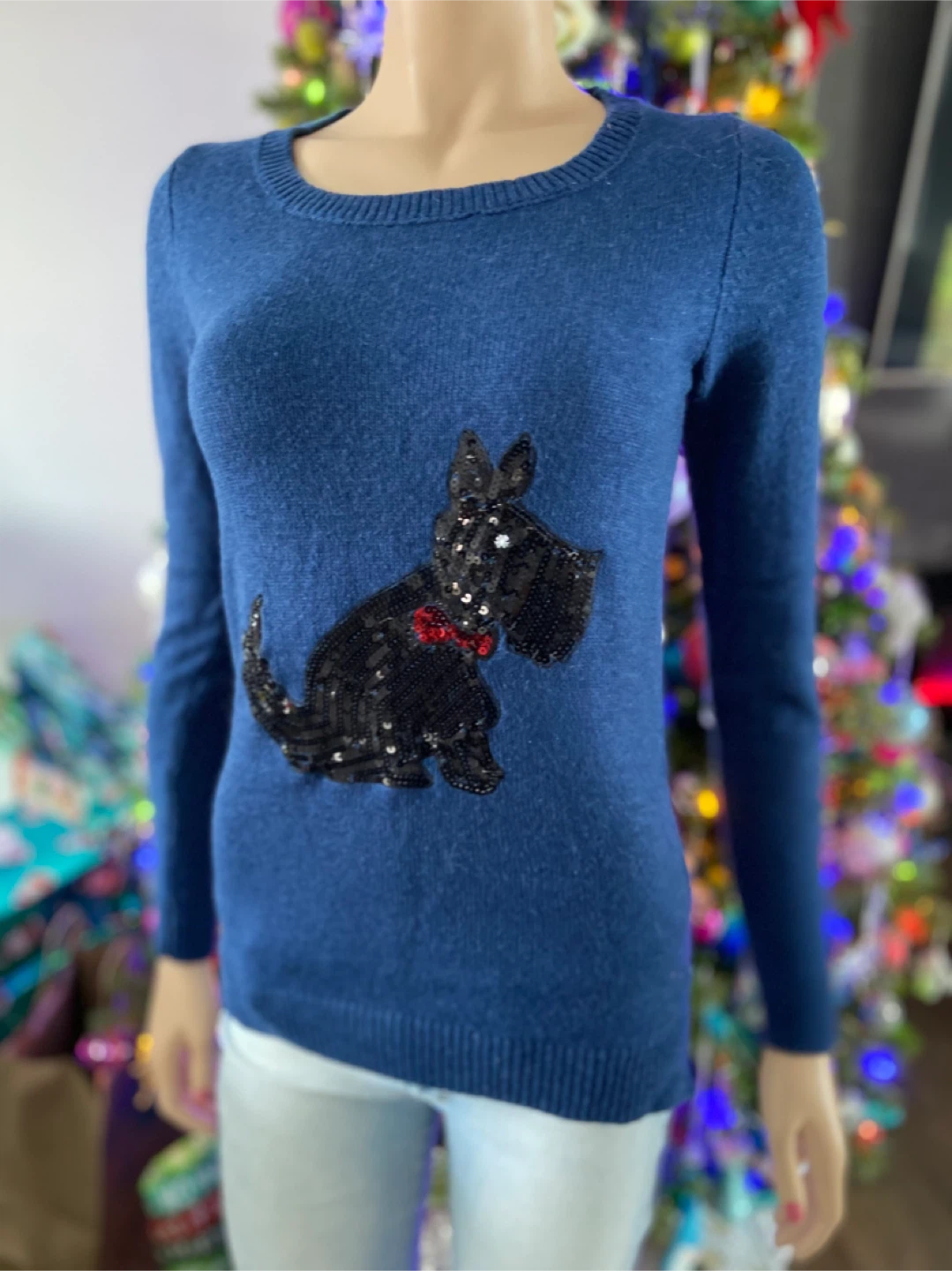 EUC: Ricki’s Blue Sweater with Sequin Scottie Dog XS