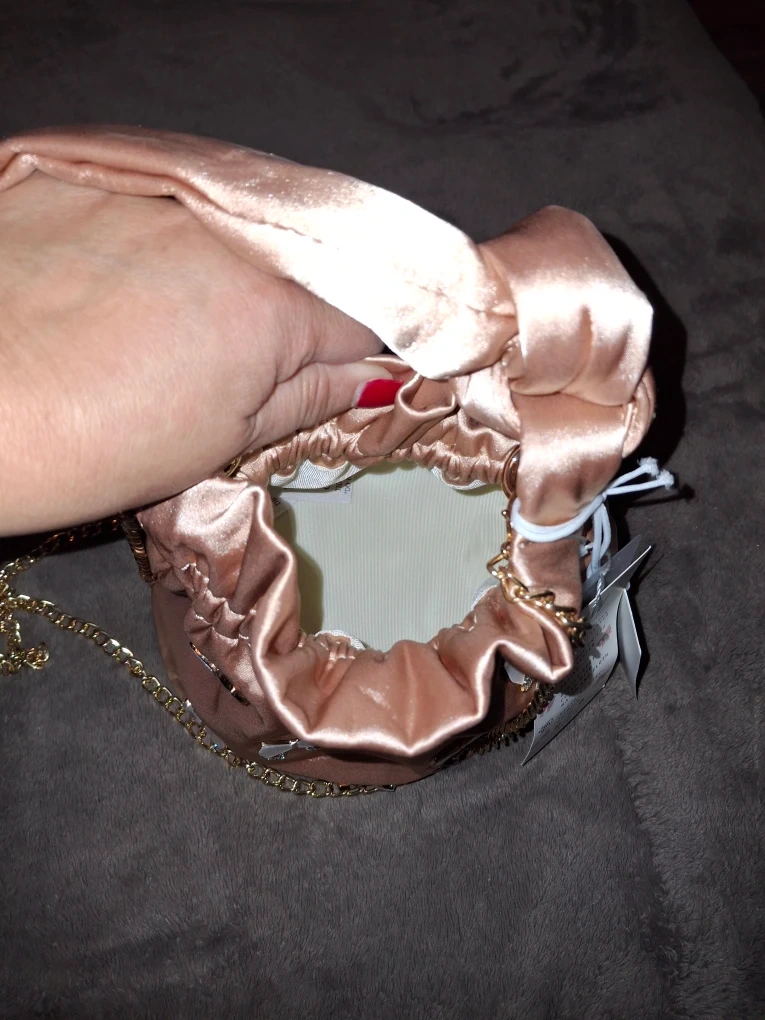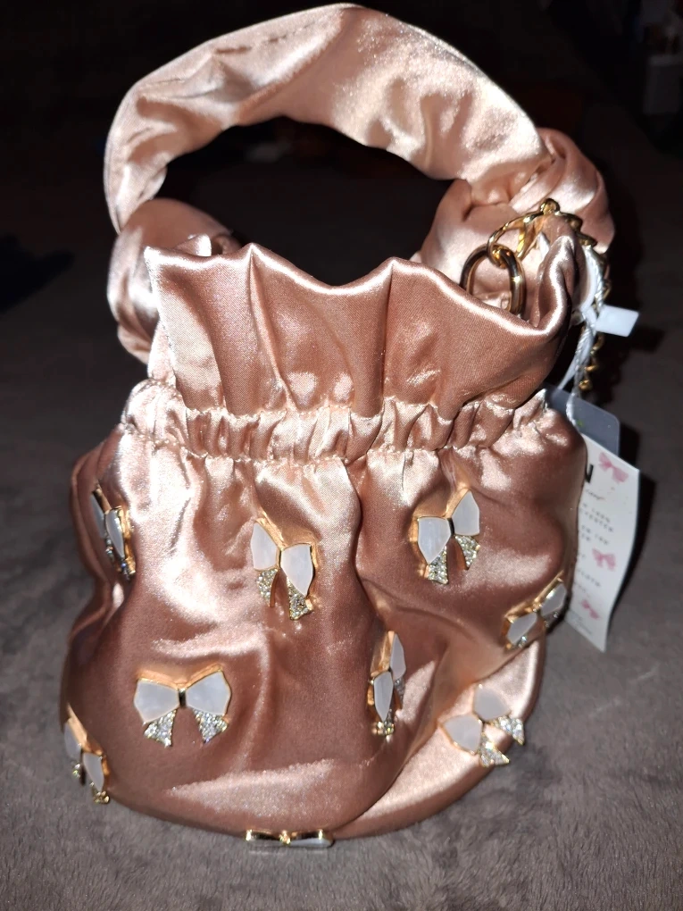 This is a super cute pink satin bucket bag! It features a drawstring closure, a top handle, and a gold chain strap. It's decorated with little bows. Perfect for a night out!