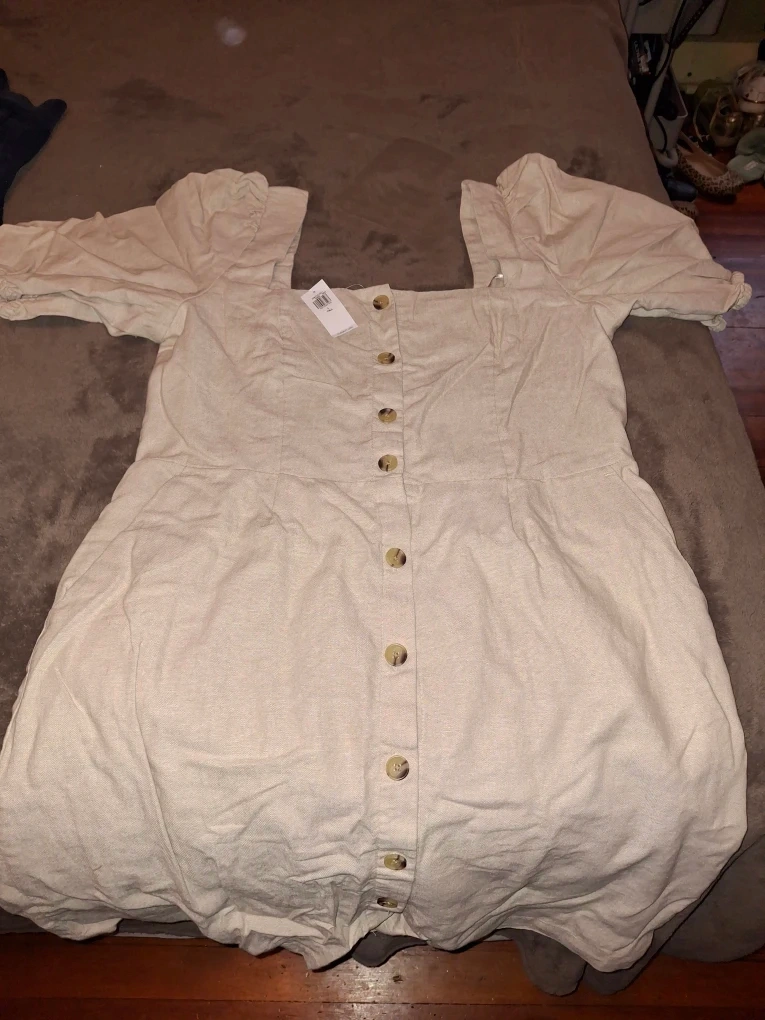 Selling a cute Old Navy dress in a size L Tall! The dress is a lovely beige color and features a button-up front. Perfect for a casual day out or a summer evening