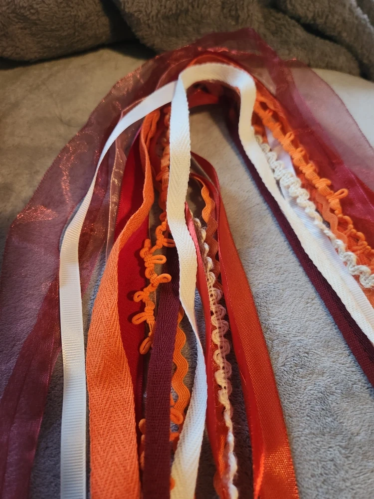 I'm selling a bundle of ribbon scraps in various shades of red, orange, and white. These are perfect for crafting projects, embellishments, or adding a unique touch to your creations! There are different textures and widths in this bundle.