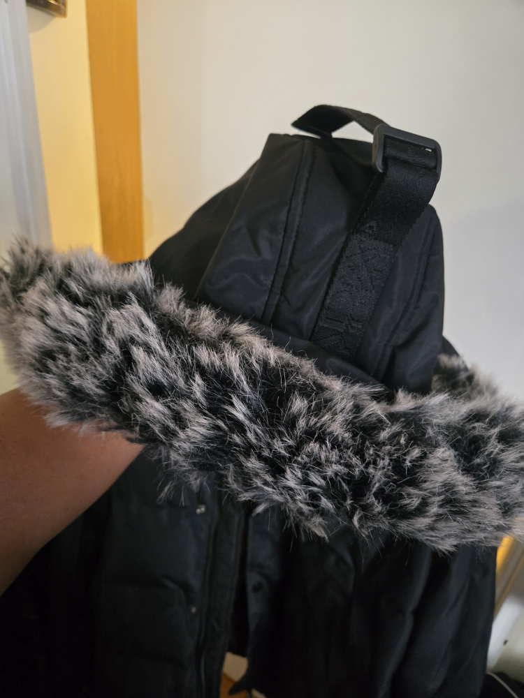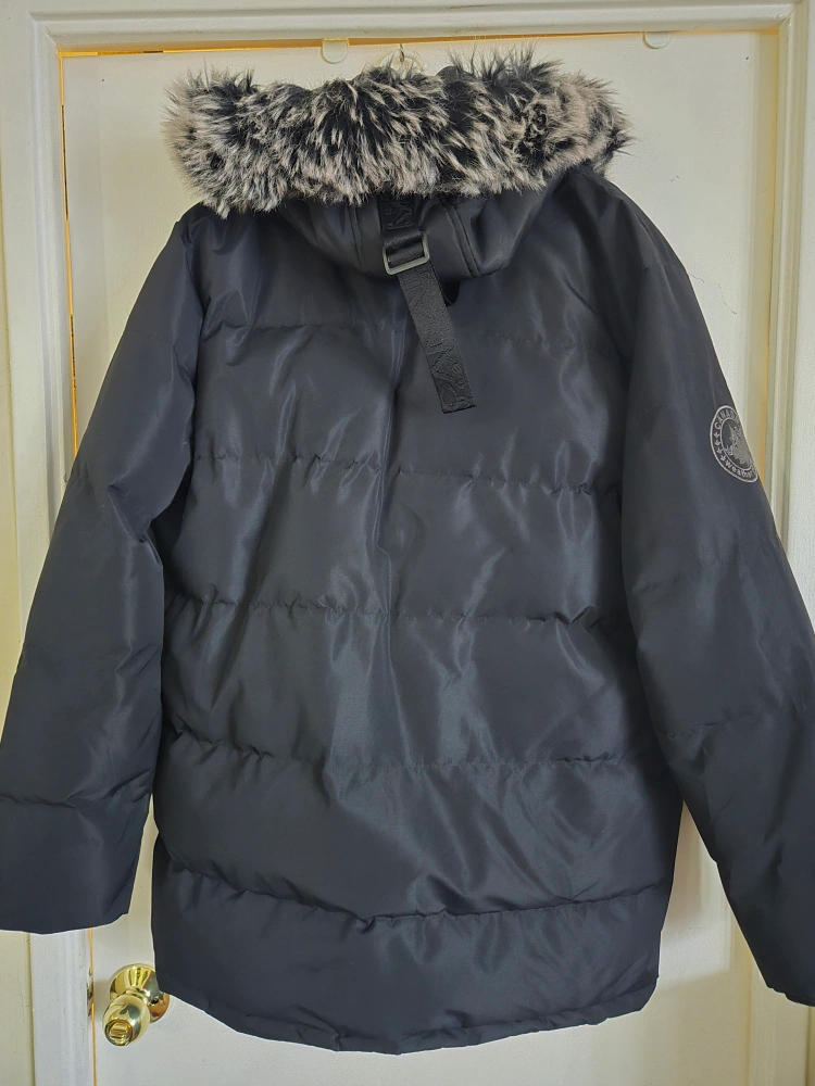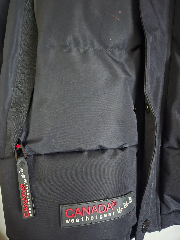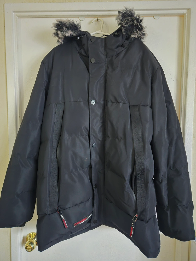 Selling a Canada Weather Gear puffer jacket in black. It's designed in Canada and features water-resistant fabric. It also has a fur-trimmed hood to keep you extra warm!
