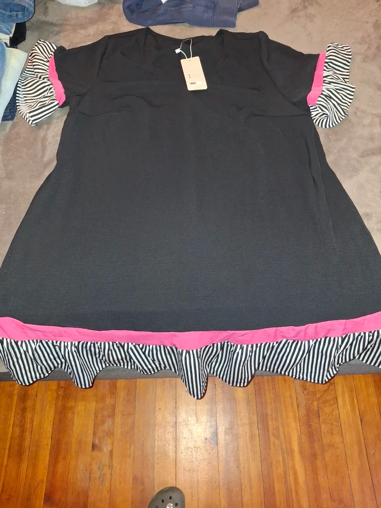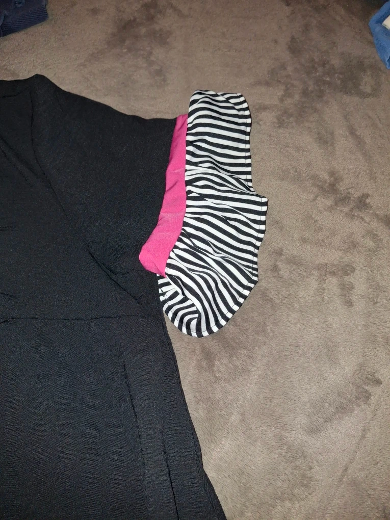 This is a cute black dress with striped and pink trim. It's in great condition and ready for a new owner! The dress features a v-neck and short sleeves.