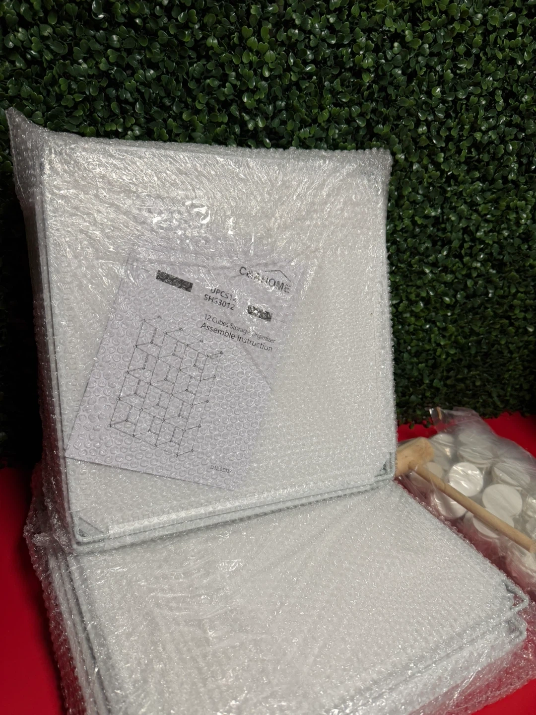 I have a brand new C&A Home 12-cube storage organizer for sale! It's still in its original packaging and ready to assemble. It comes with all the necessary components and accessories, including a little wooden hammer to help assemble it. It's a great way to organize your space and add a touch of style to your home!