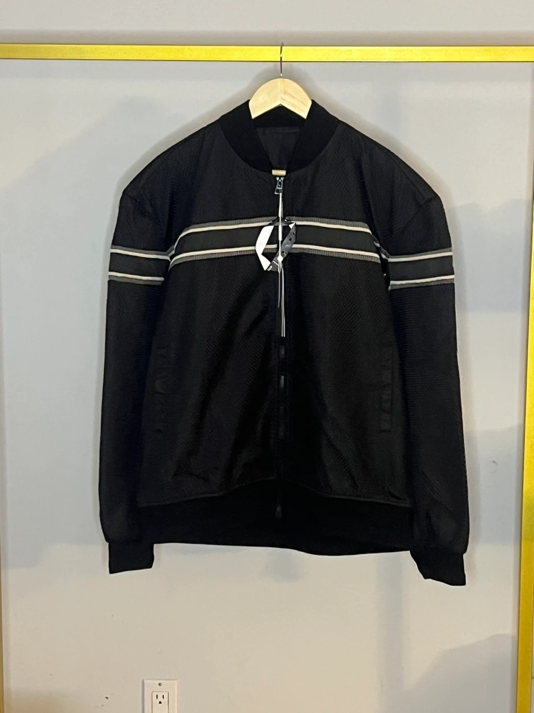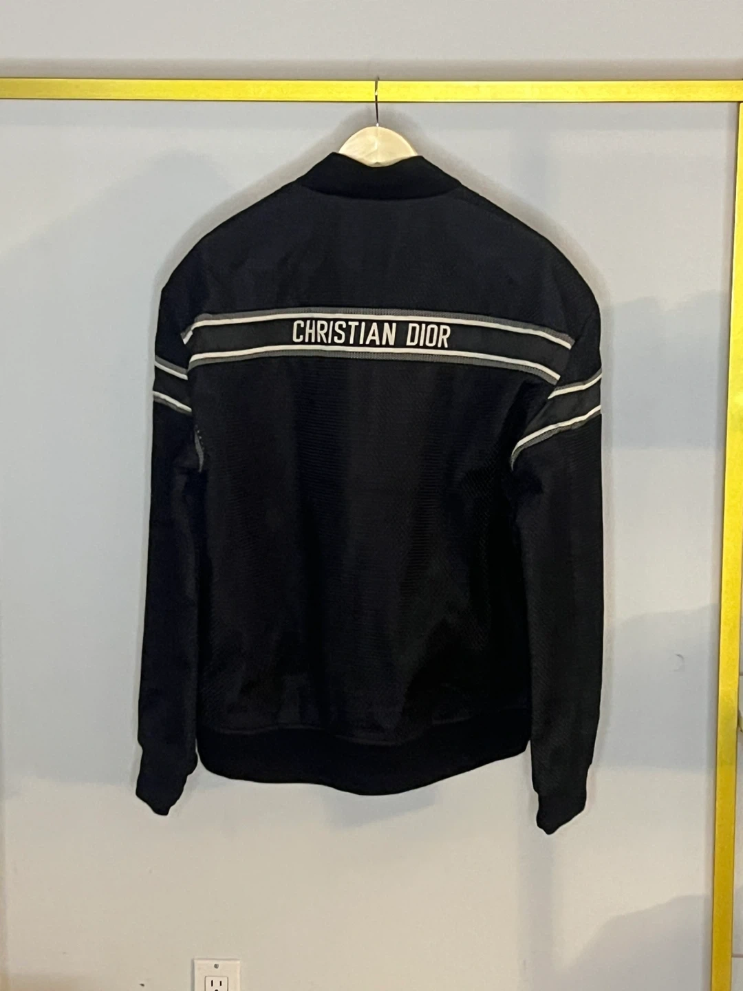 Here is a top quality Christian Dior black jacket. It has a stripe design across the chest and arms.