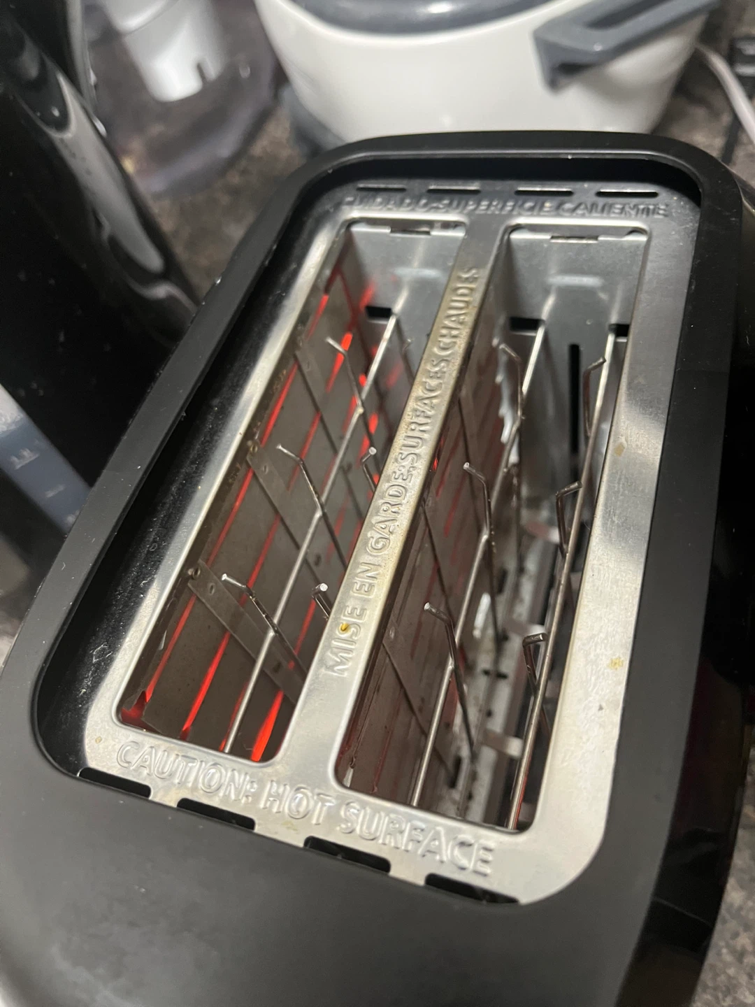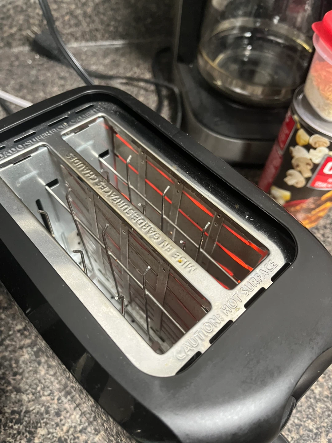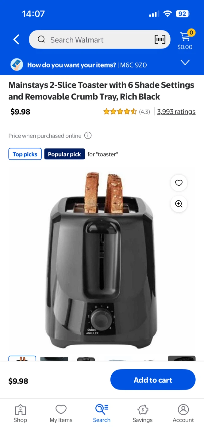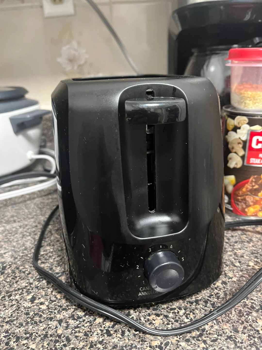 Selling a Mainstays 2-Slice Toaster in black. It has 6 shade settings and a removable crumb tray. Originally bought for $9.98.