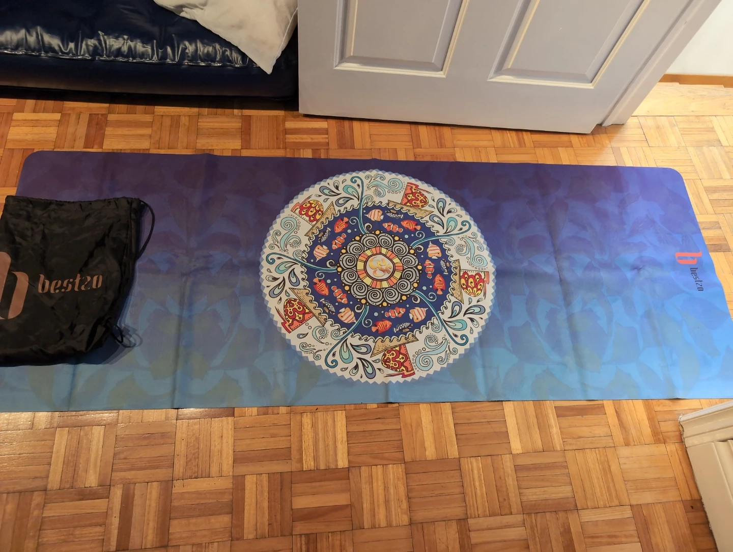 Selling a Bestzo yoga mat that comes with a handy carrying bag! The mat has a beautiful design and is perfect for your yoga or exercise routines. It's in great condition and ready for a new owner. It is foldable to travel, in a luggage. Brand new, never use it.