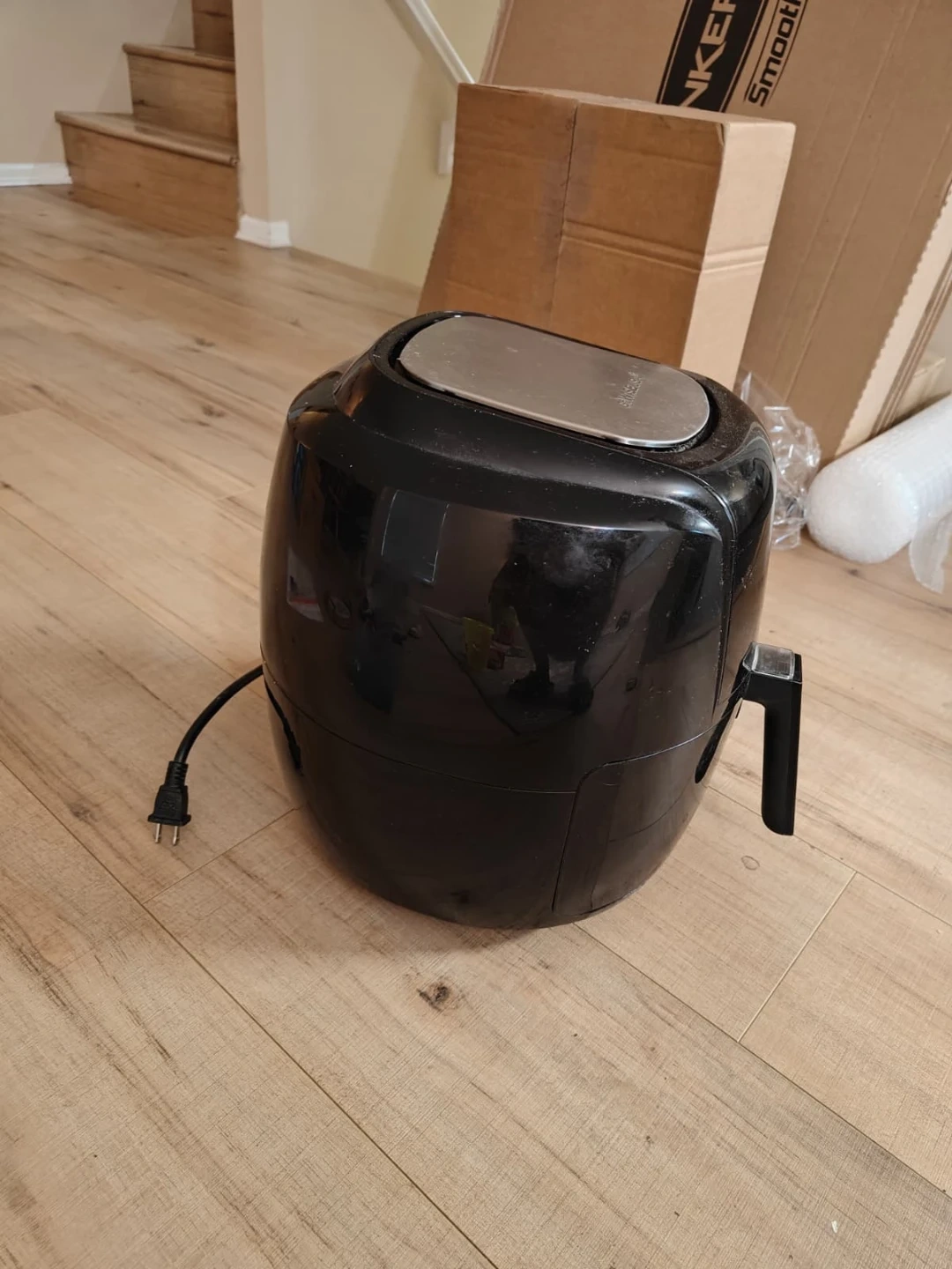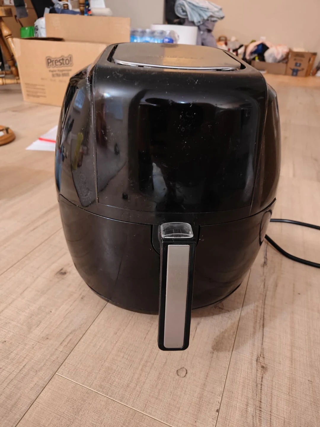 Selling a black Presto air fryer. It's in used condition but still works great for cooking up your favourite foods! It has a digital display and a basket for easy frying