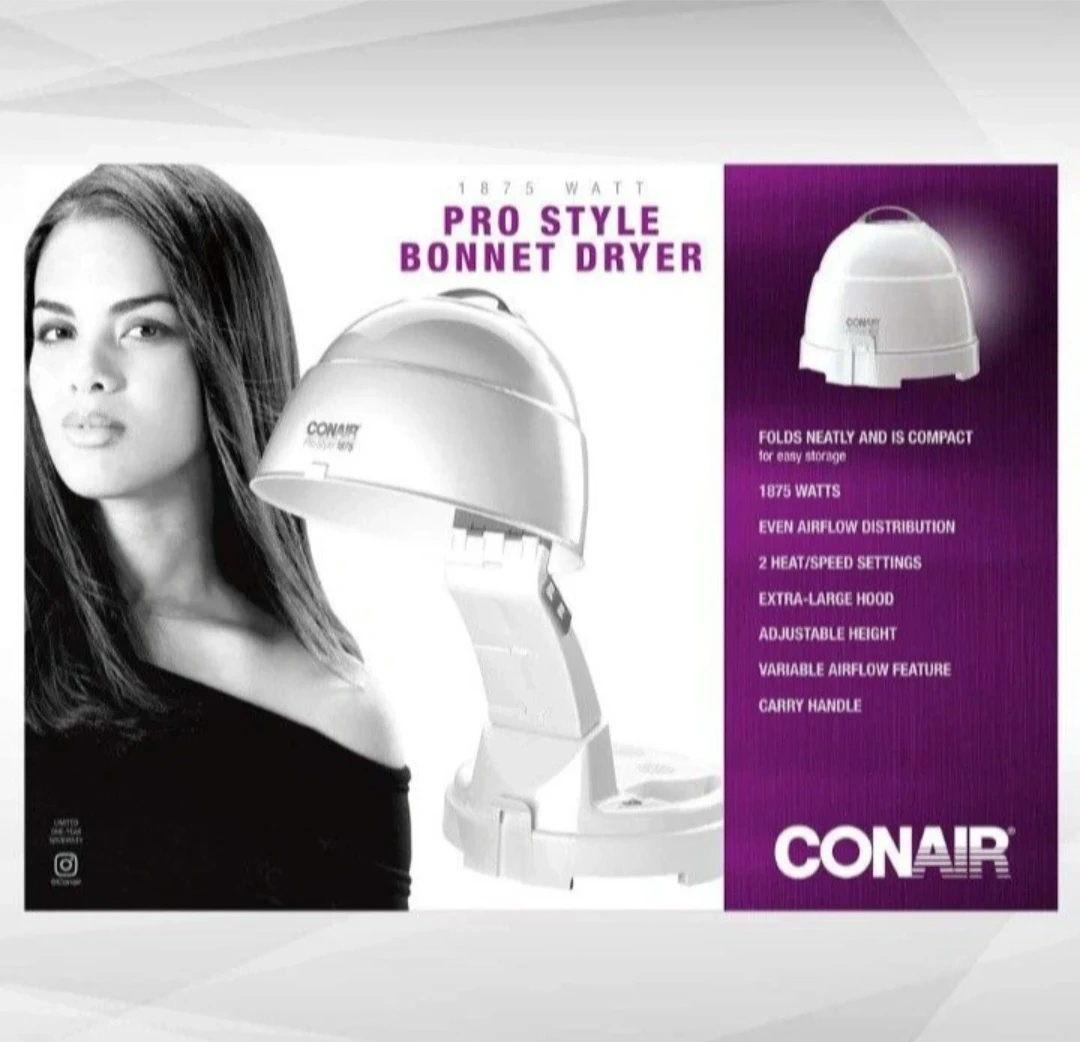 Get salon-quality hair at home with this Conair Pro Style Bonnet Dryer! It's a 1875-watt dryer that folds neatly and is compact for easy storage. It features even airflow distribution, 2 heat/speed settings, adjustable height, variable airflow, and a carry handle. Perfect for achieving your desired hairstyle in comfort!