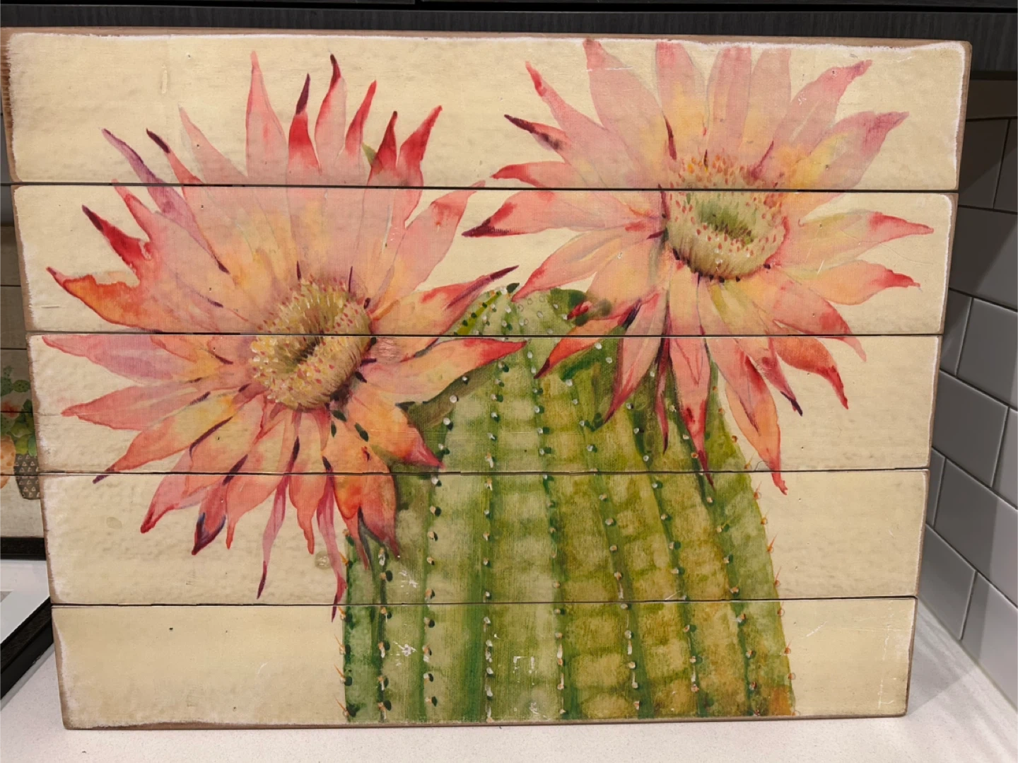 Cute cactus-themed wall art to brighten up any room! Features a charming design printed on wooden planks. Perfect for adding a touch of desert vibes to your home decor