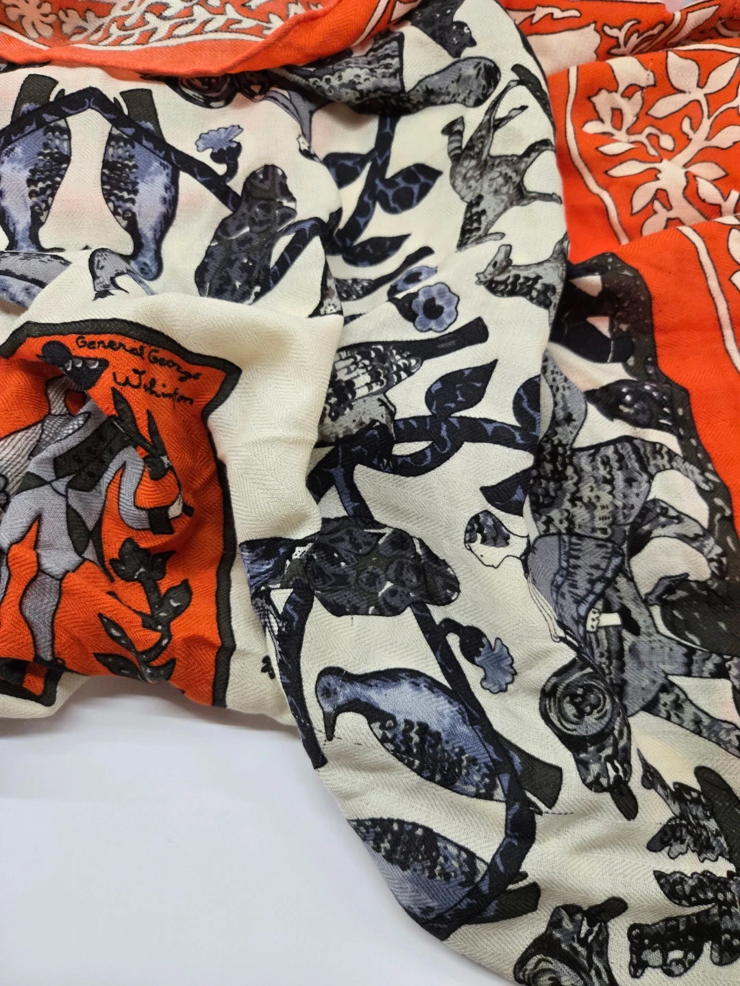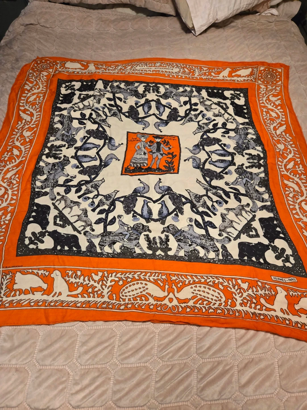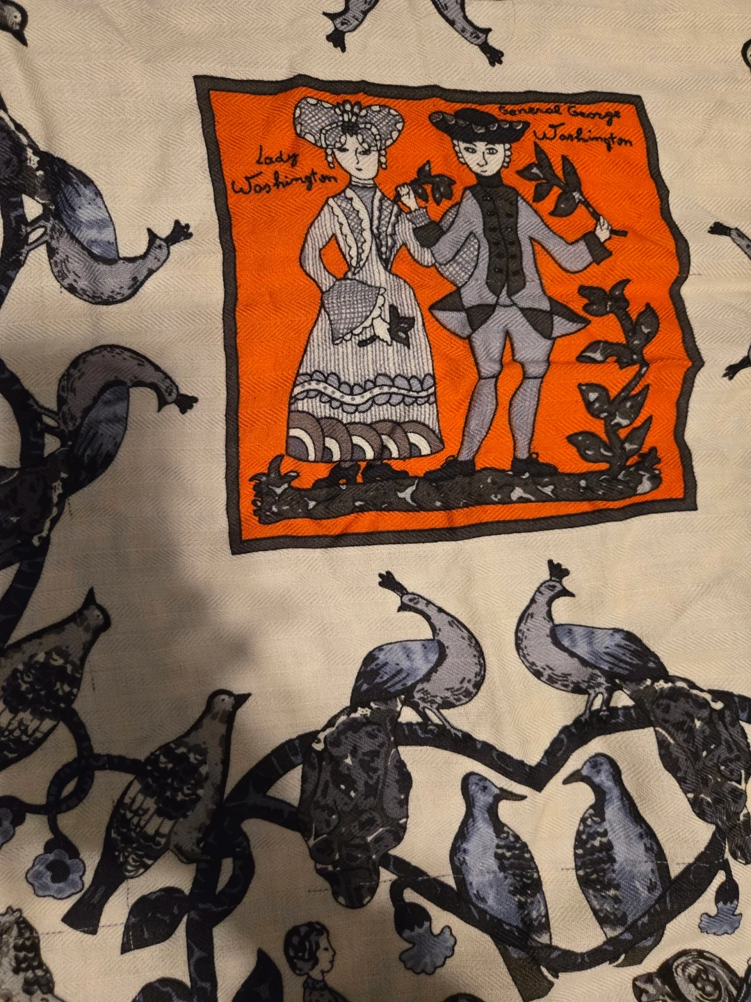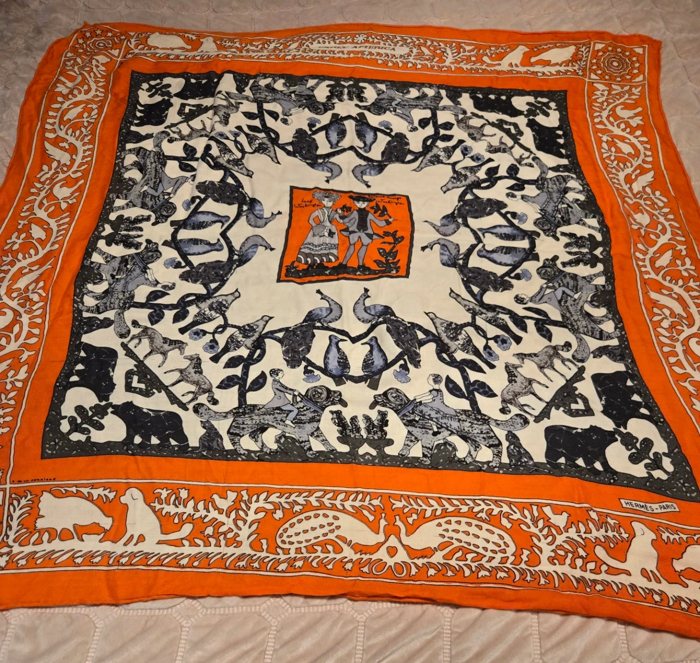 Beautiful Hermès Paris scarf featuring an Early America design with images of General George Washington and Lady Washington. The scarf has an orange border with a white and grey patterned centre. A lovely addition to any wardrobe!
