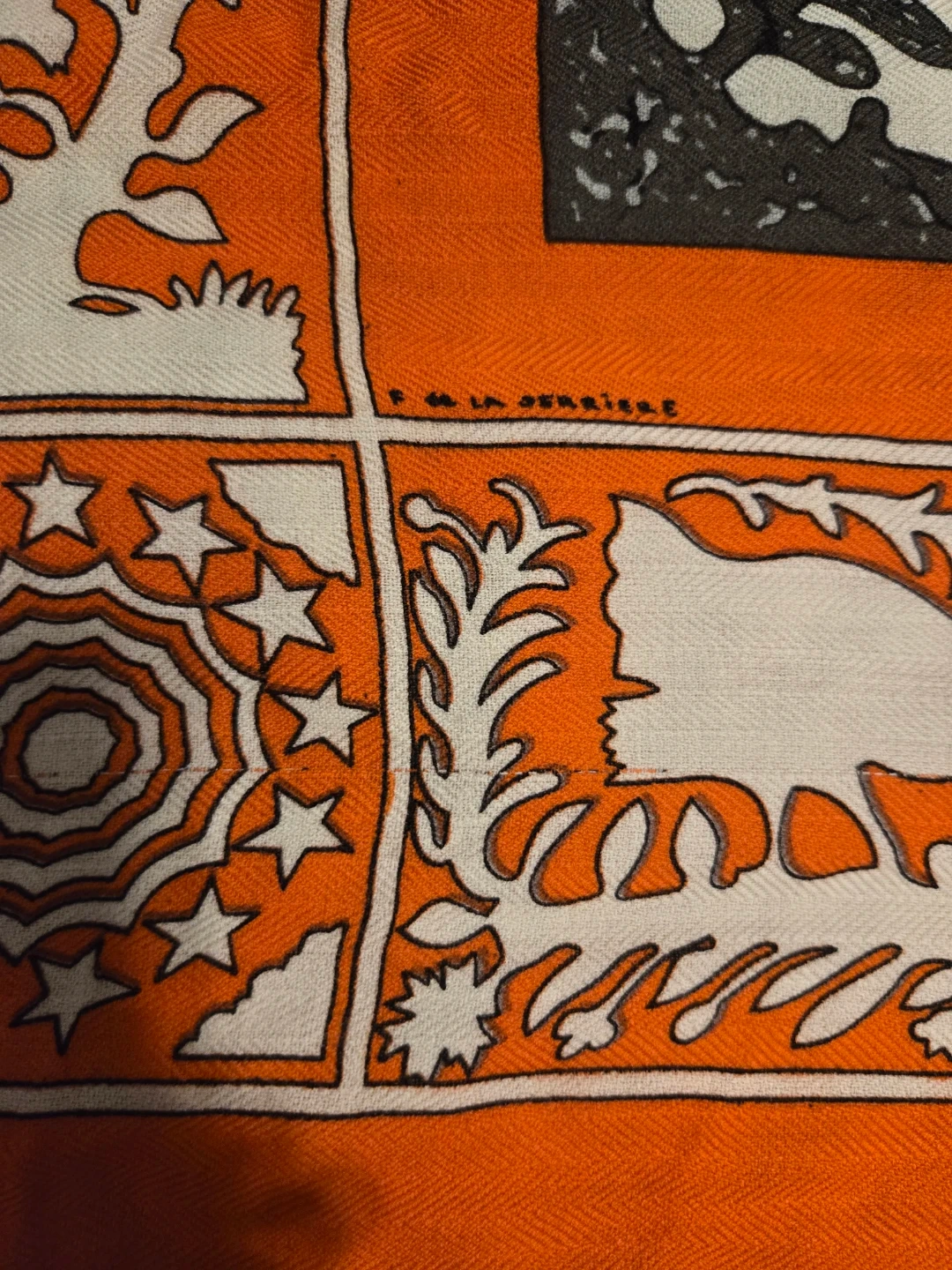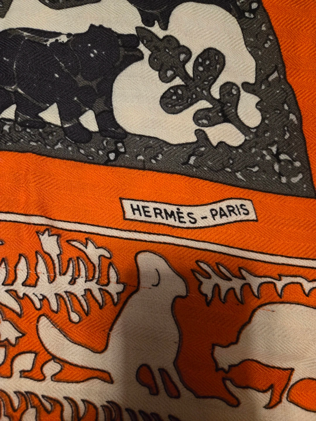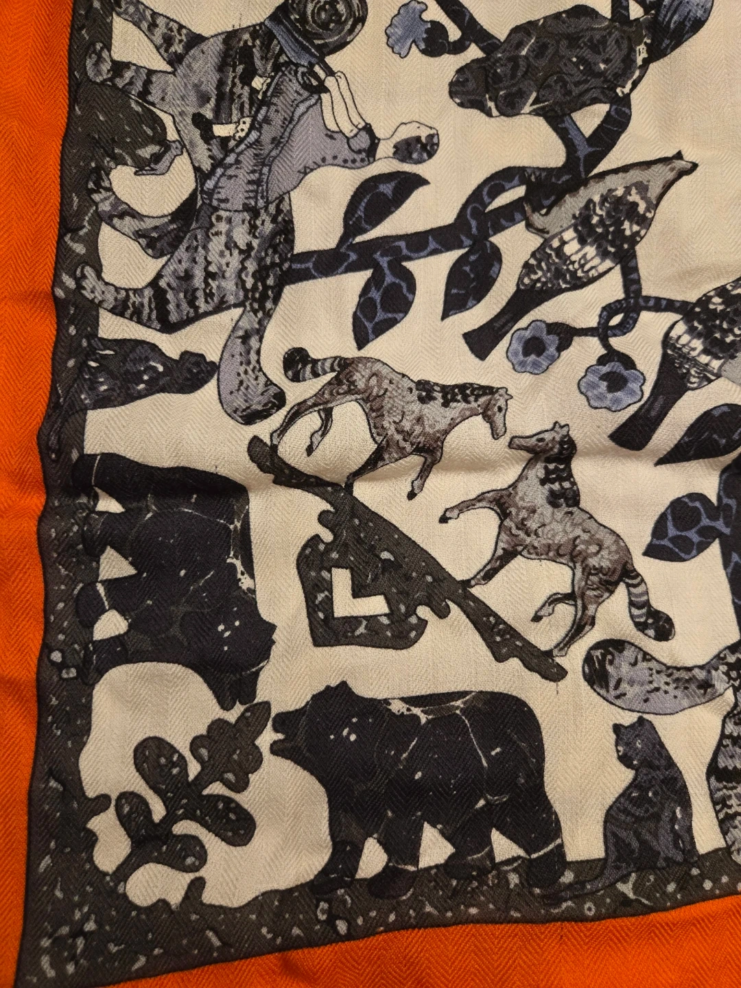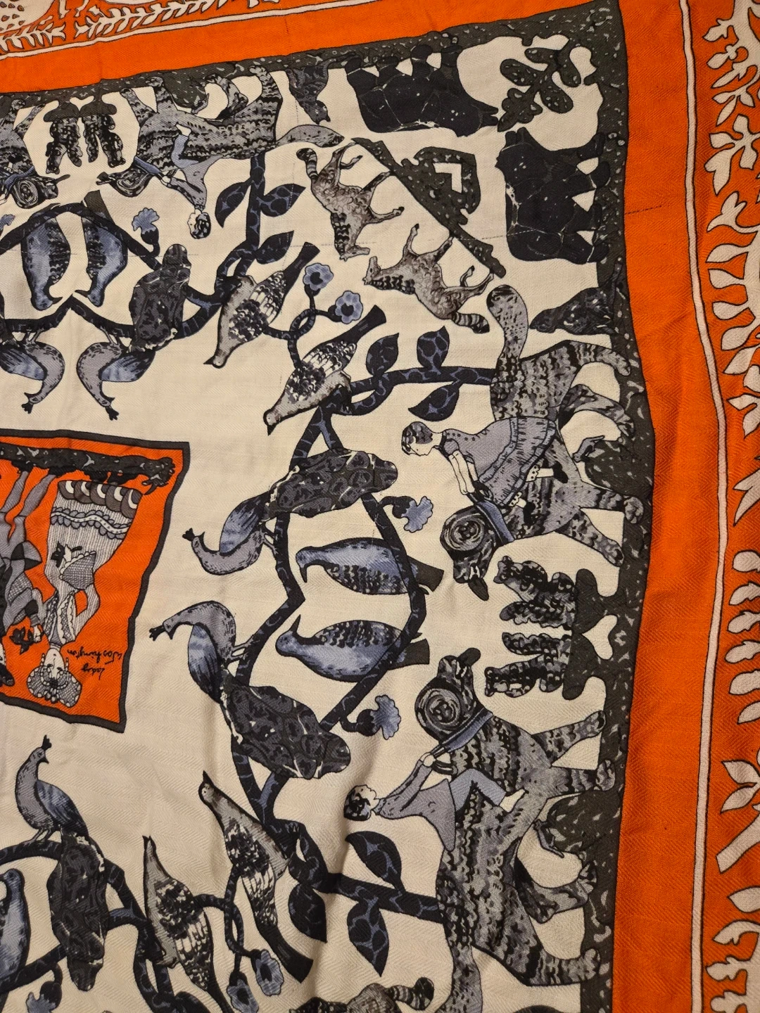 Beautiful Hermès Paris scarf featuring an Early America design with images of General George Washington and Lady Washington. The scarf has an orange border with a white and grey patterned centre. A lovely addition to any wardrobe!