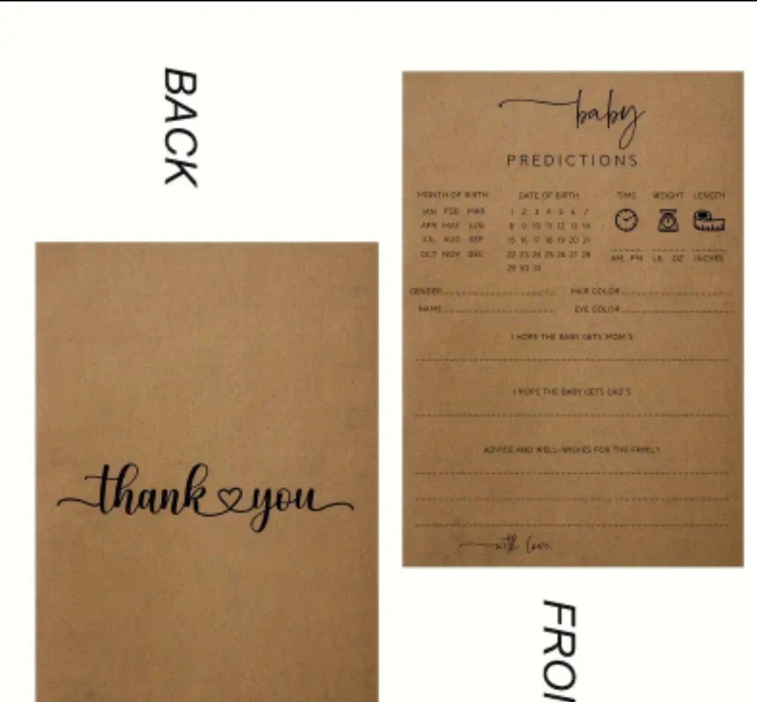 I'm selling baby prediction cards and baby name suggestion cards. They're perfect for baby showers or gender reveal parties! They're in great condition and ready to use for your special event.