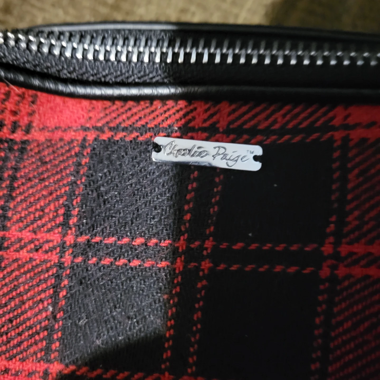 Selling a cute Charlie Paige crossbody bag with a red and black plaid pattern. It also comes with a matching pair of gloves! The bag has a black strap and zipper, perfect for adding a pop of colour to any outfit