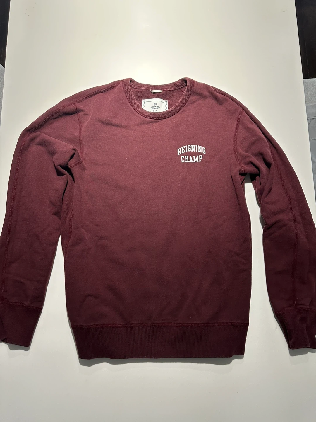 Selling a Reigning Champ crewneck in a nice burgundy colour. It's in great shape and ready for a new home! The size is not indicated, but it looks like a size medium.