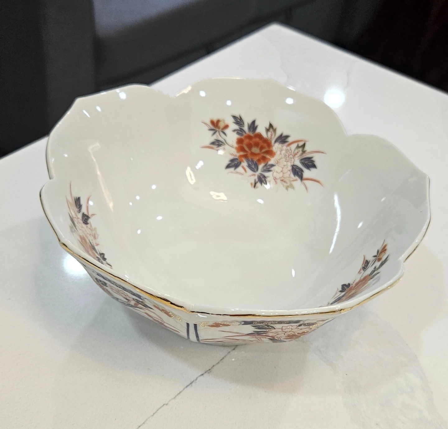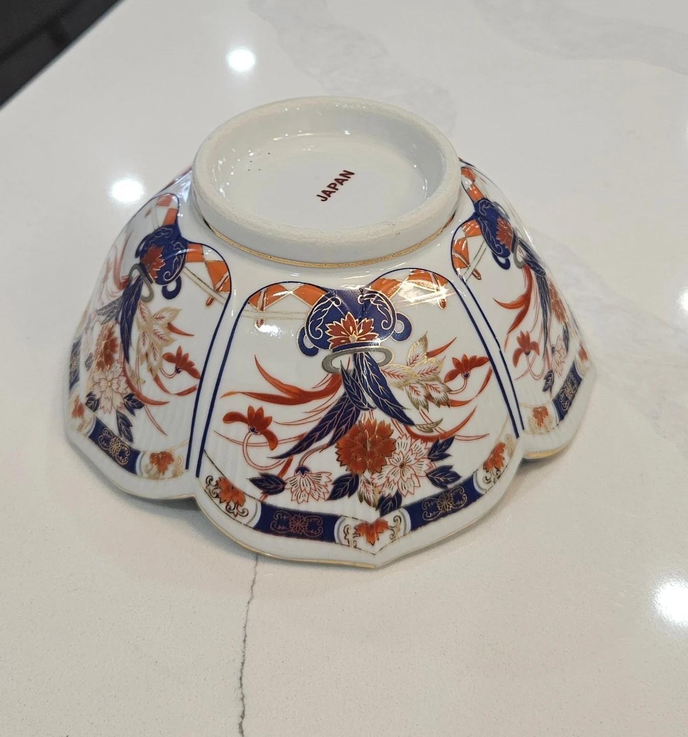 This is a vintage porcelain bowl featuring a scalloped edge and intricate floral designs in traditional Imari colors of blue, red, and gold. Selling as is