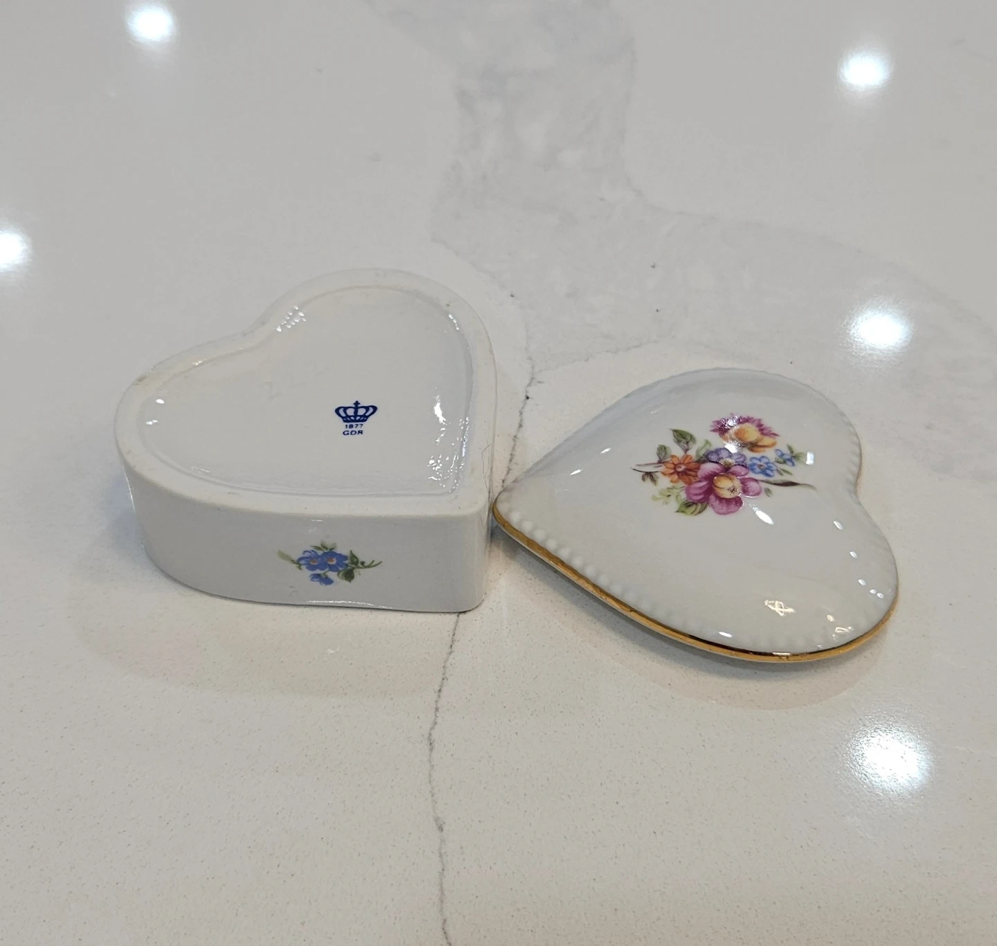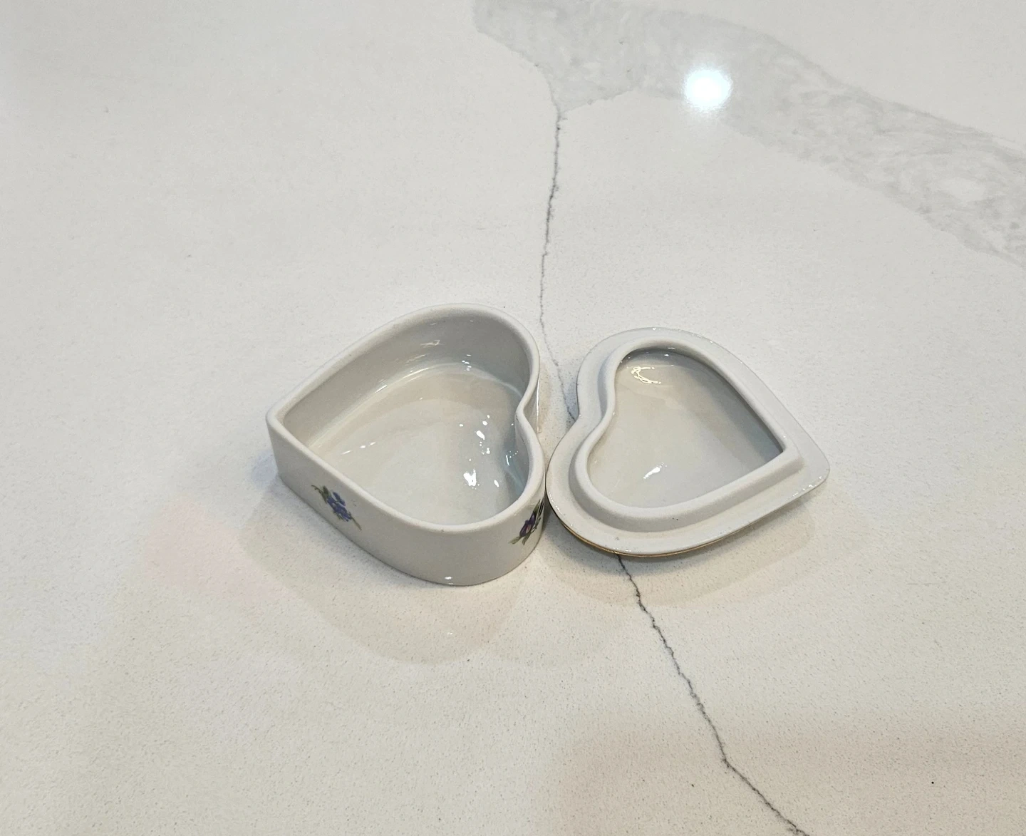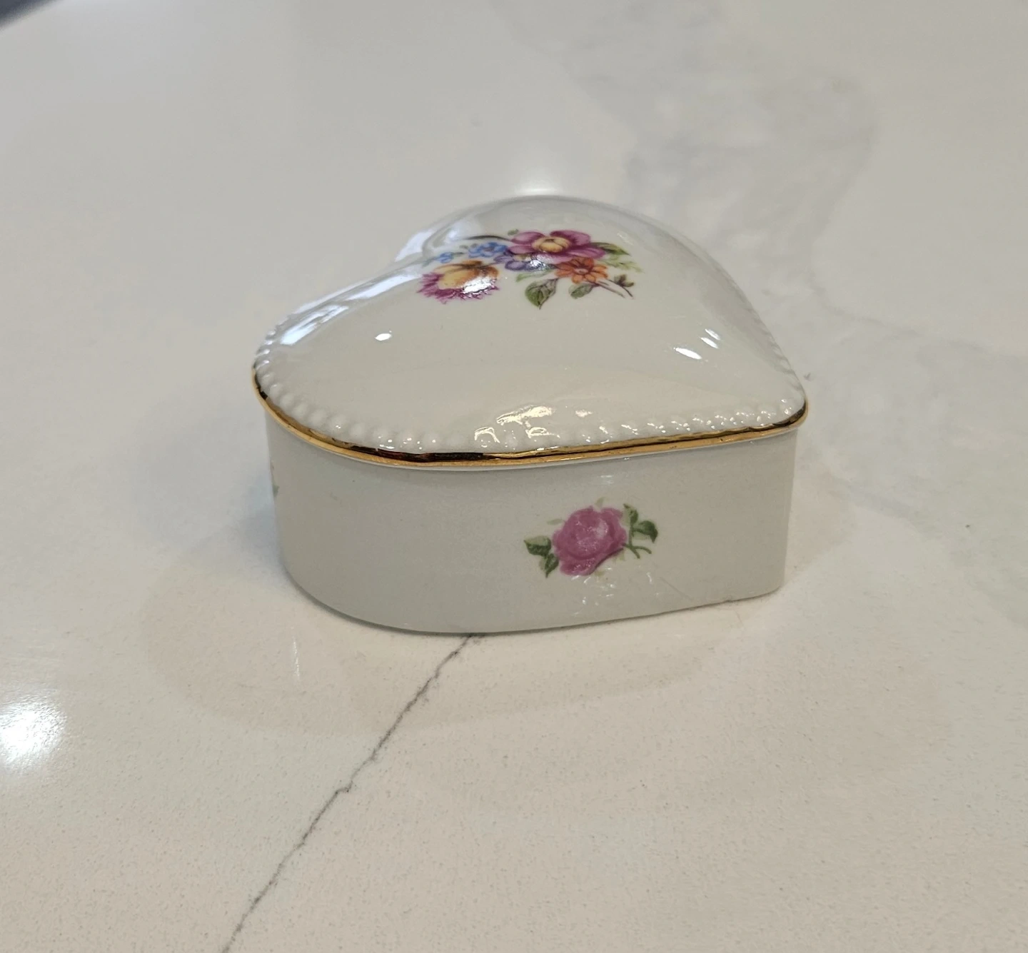This is a lovely heart-shaped porcelain trinket box. It features delicate floral designs and a gold trim. Perfect for storing small treasures or adding a touch of elegance to your space