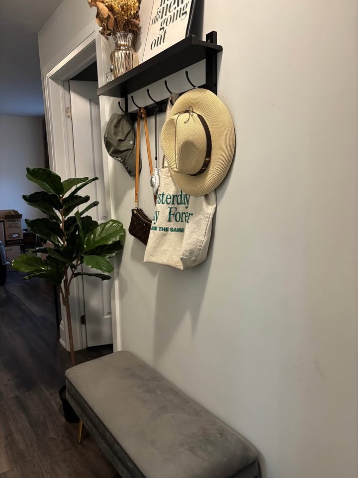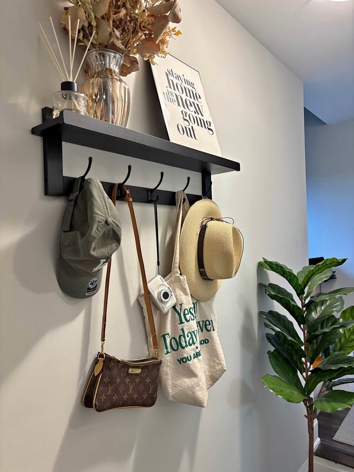 Looking to add some organization to your entryway? This wall-mounted shelf with hooks is perfect for hanging coats, hats, and bags. It's in great condition and ready to be mounted in your home. The shelf is black and has a sleek, modern look that will complement any decor
