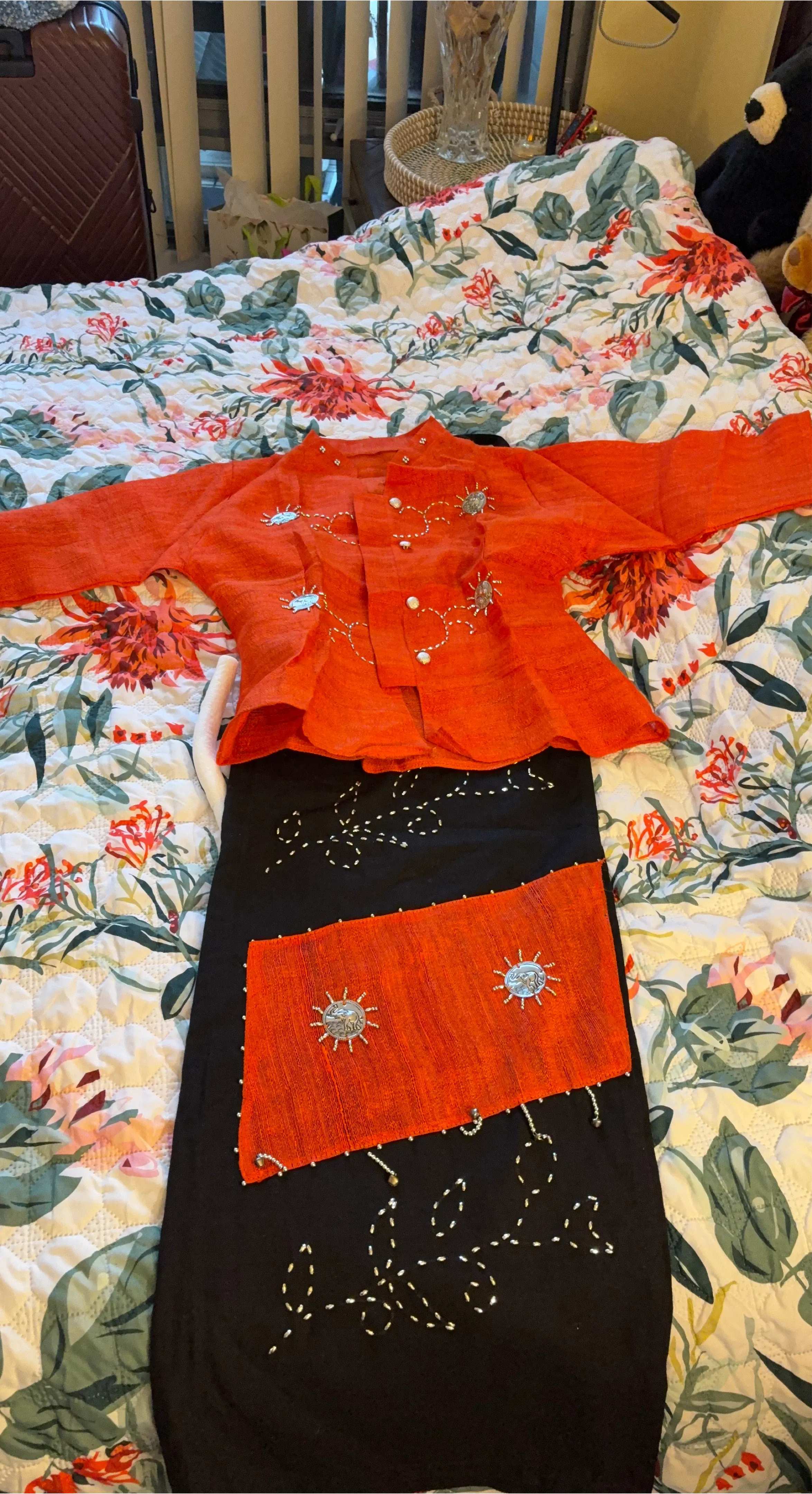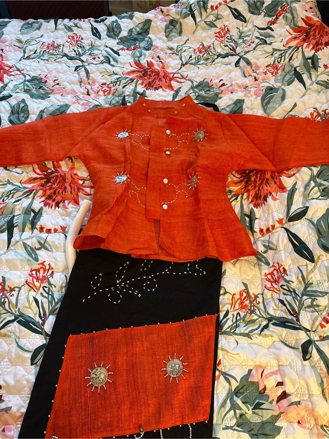 Selling a unique orange and black outfit with intricate embroidery. The top is a vibrant orange with delicate white button closures, and the skirt is a sleek black with matching embroidered details. Perfect for adding a pop of colour and artisanal touch to your wardrobe!