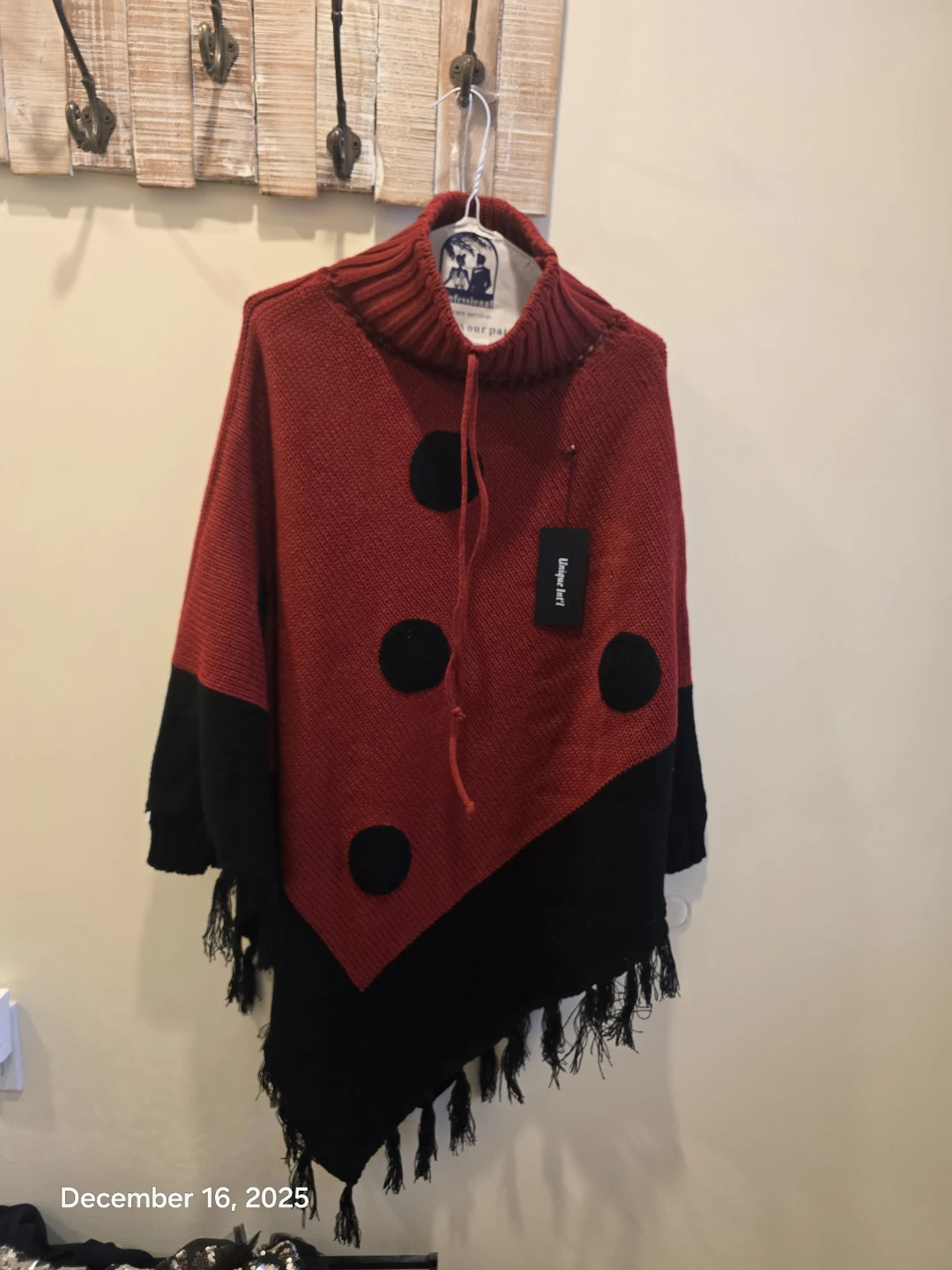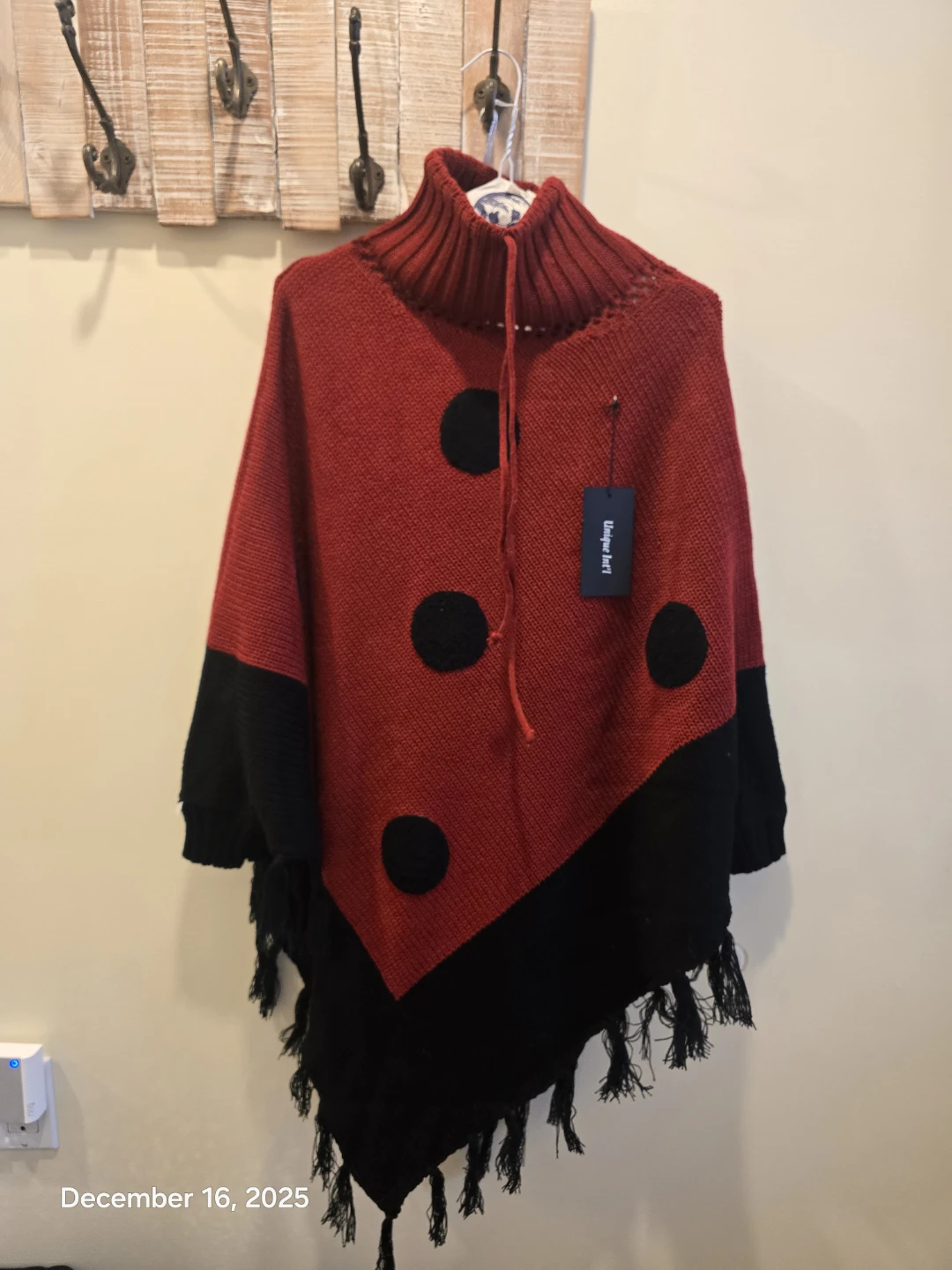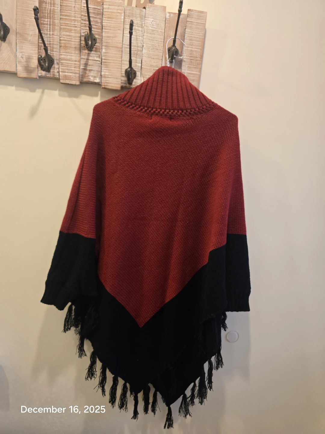 This is a brand new Unique Intl poncho in one size. It's a beautiful red and black colour with a unique design. It would be a great addition to your wardrobe!