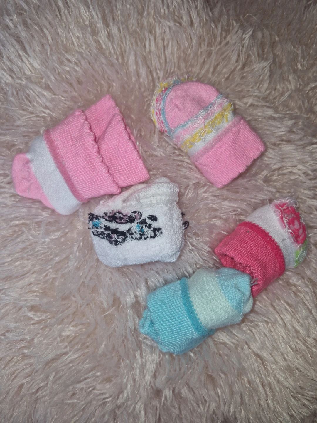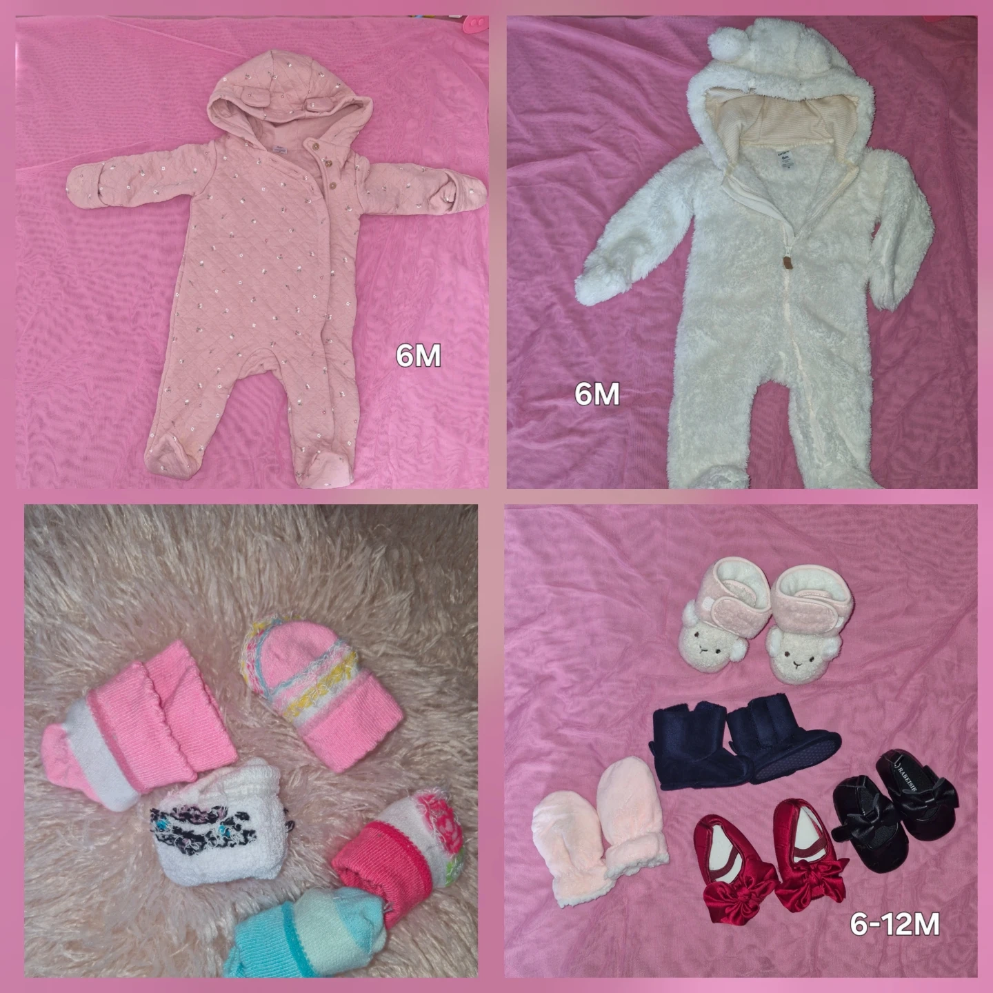 Pants, leggins, bluses, coats, pajamas, bodysuits, t-shirts, shorts, dresses, sweters, skirts, jackets, hoodies, rompers, sleepsacks, socks, shoes, bathing suits, mittens, head bands, sunhats and sweddles.