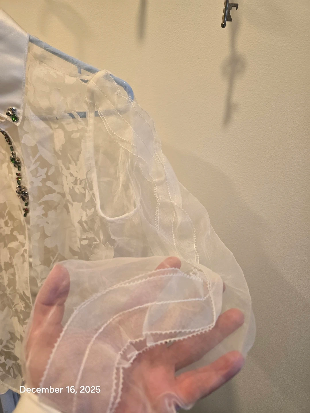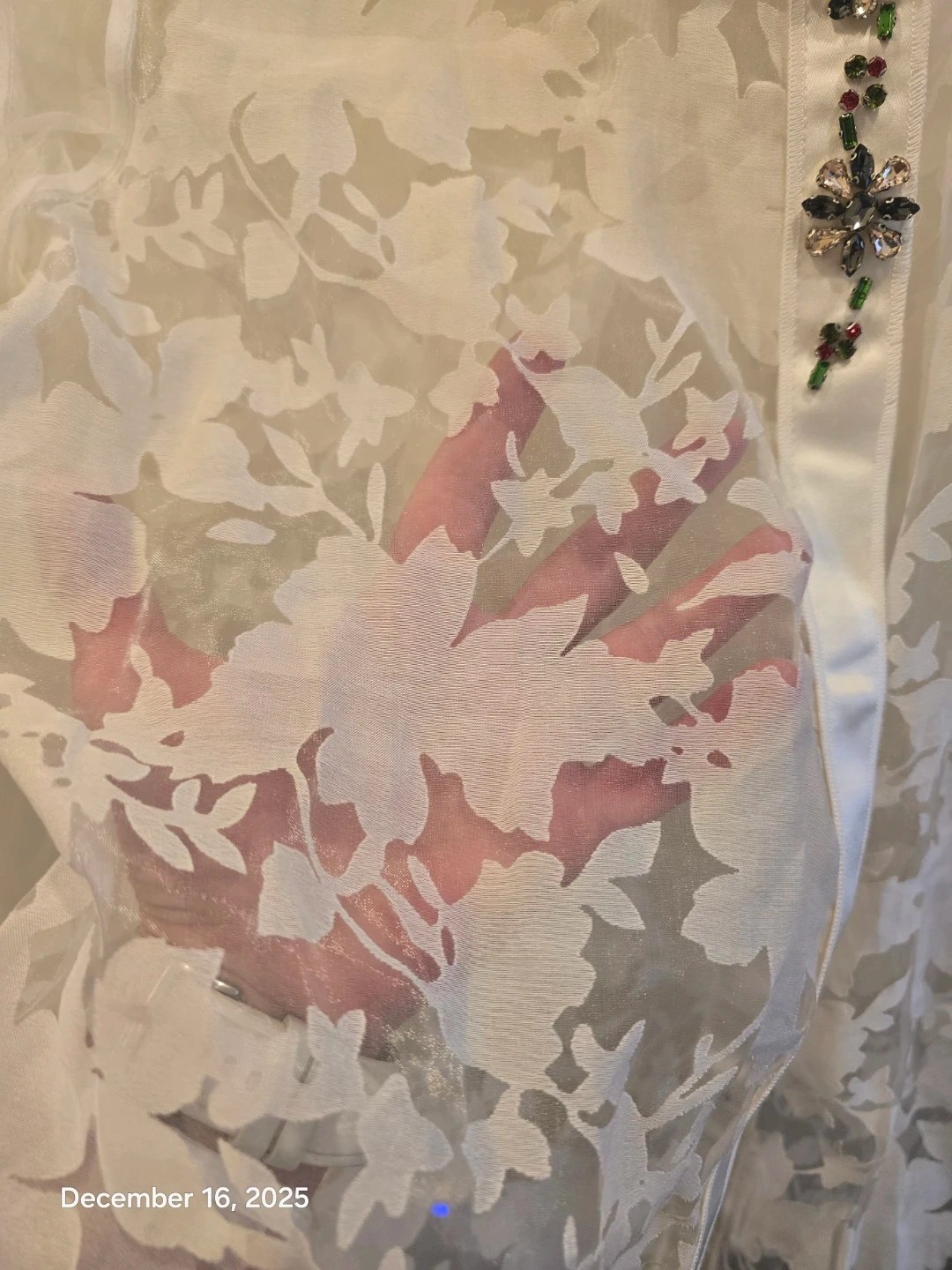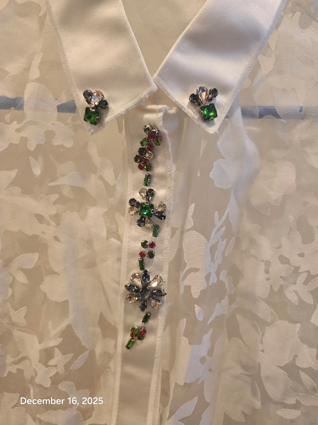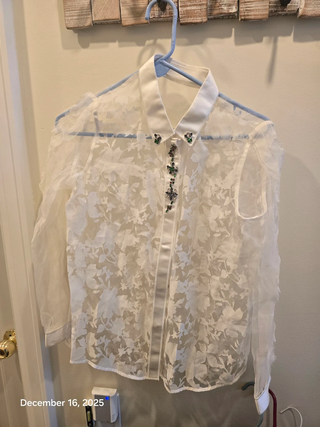 Here's a beautiful white blouse with a delicate floral pattern. It features lovely embellishments down the front. It's in great condition and would be a wonderful addition to your wardrobe!