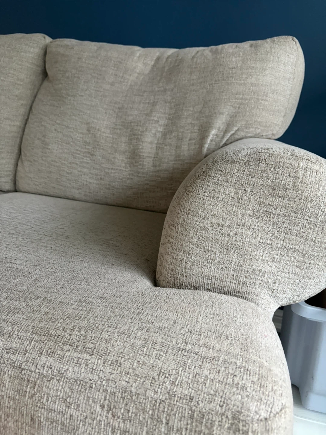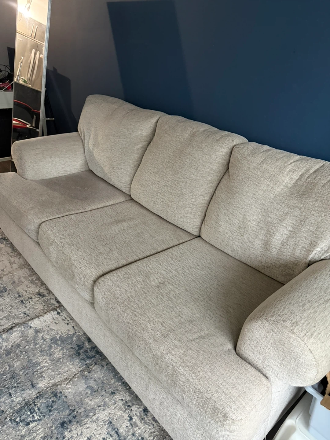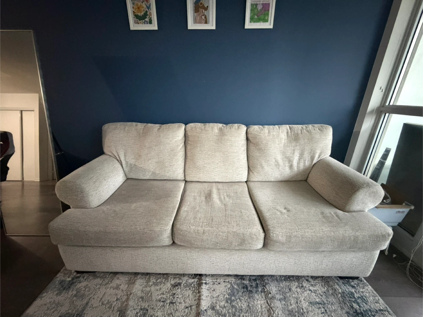 Selling a comfy beige three-seater sofa. It's in good condition and would be a great addition to any living room or den. The neutral colour makes it easy to match with any decor!