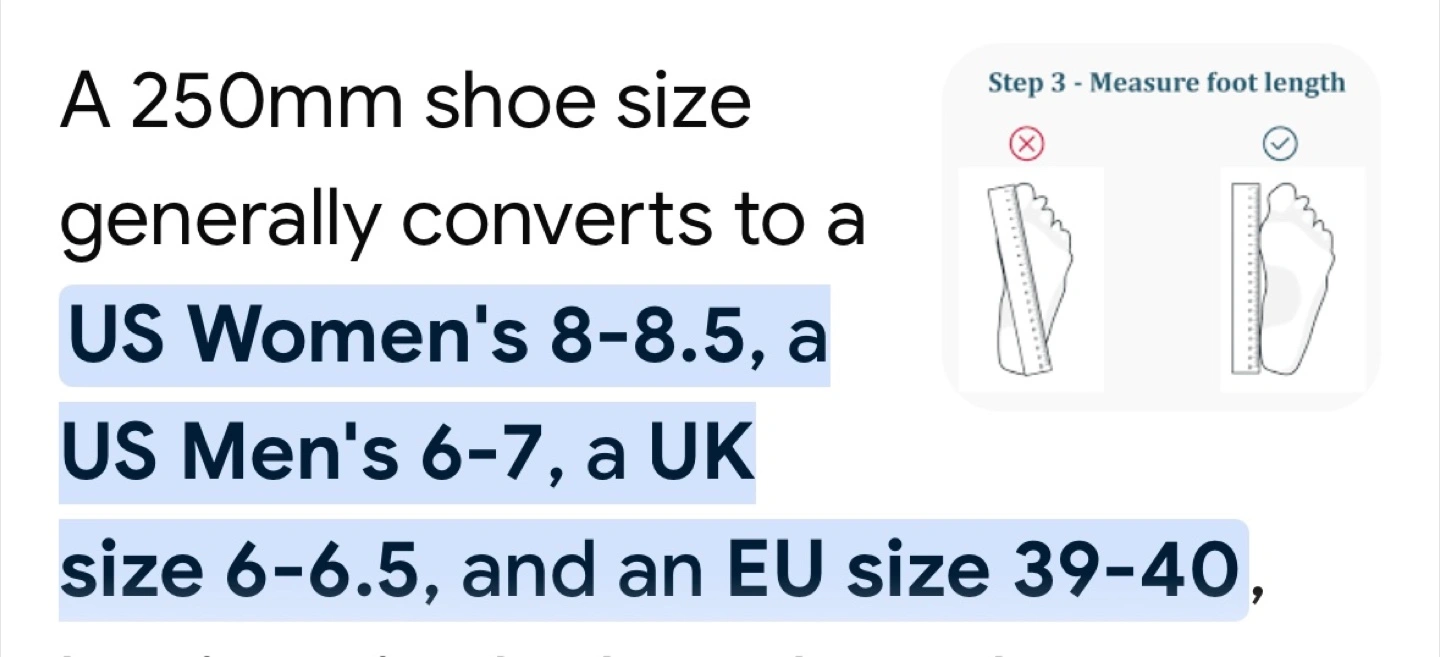 The size is 250mm, which converts to a US Women's size 8-8.5.