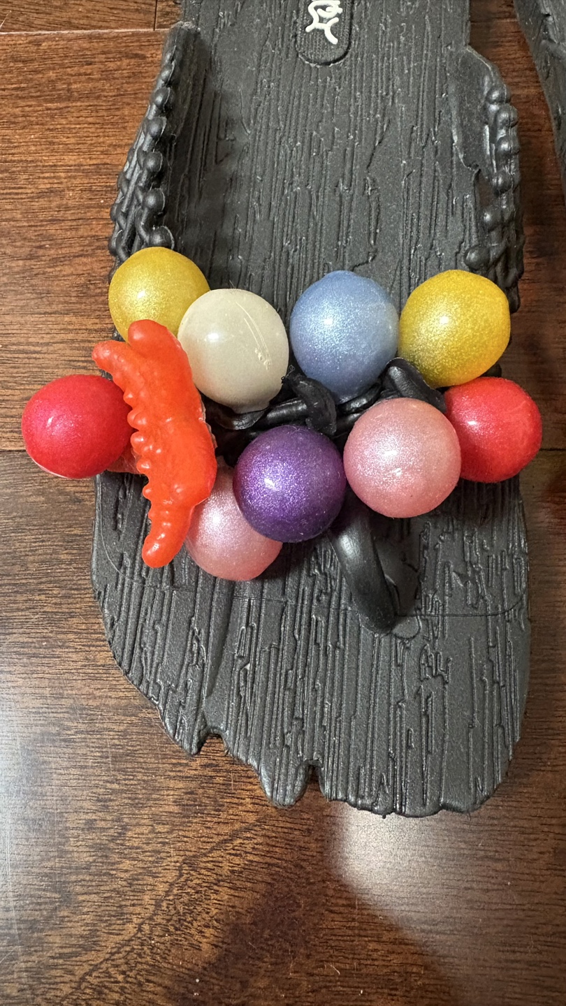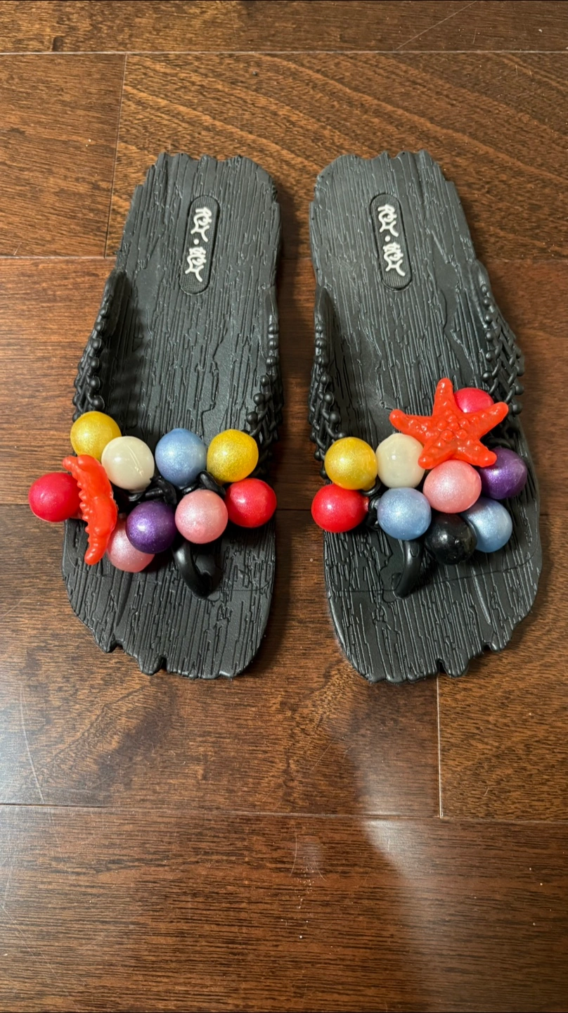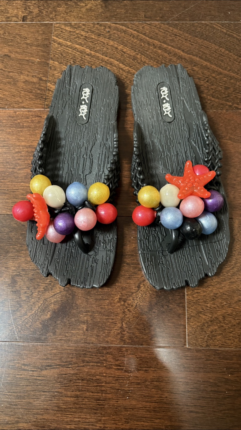 They are black with colourful beaded embellishments.