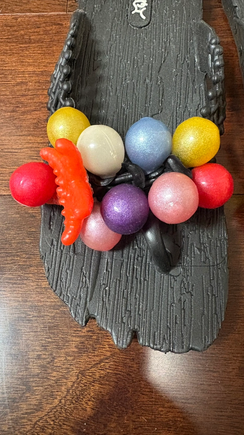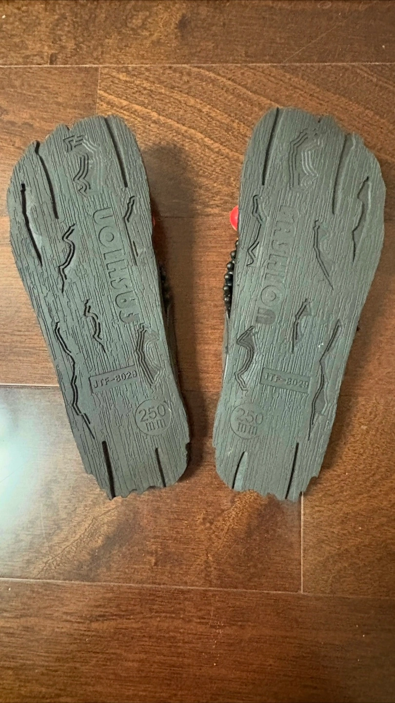 The bottom of the sandals have a wood-like texture.