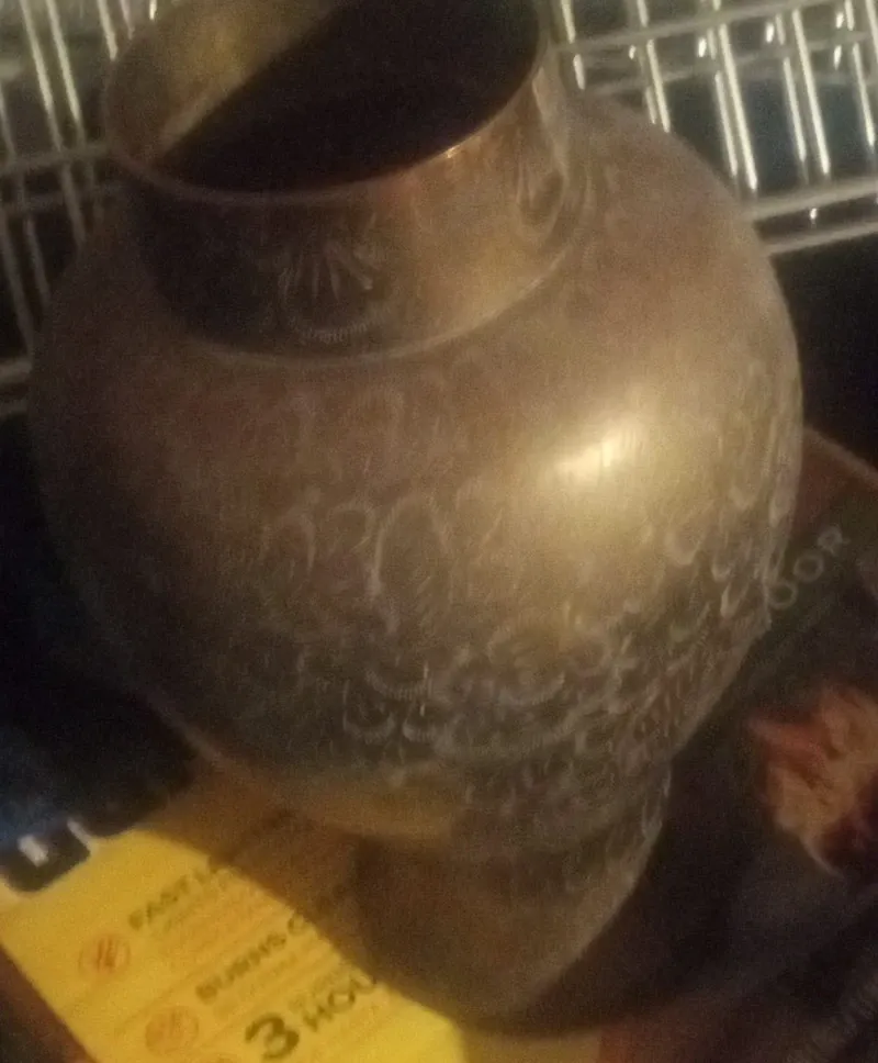 Selling a vintage etched metal vase. It has a unique design and would look great as a decorative piece in your home. It shows some signs of wear but is in good condition overall