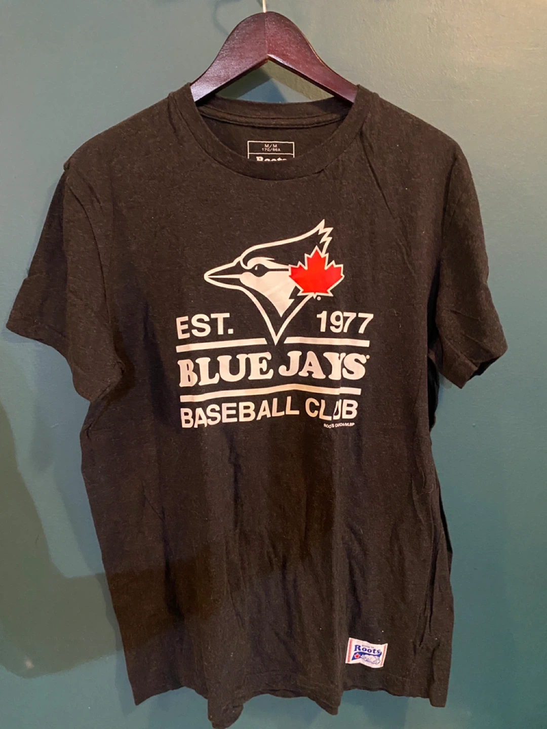 Selling a Roots t-shirt featuring the Toronto Blue Jays Baseball Club logo.