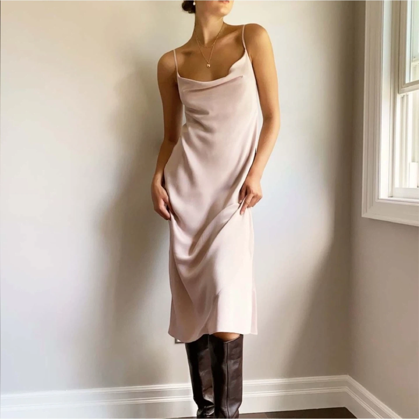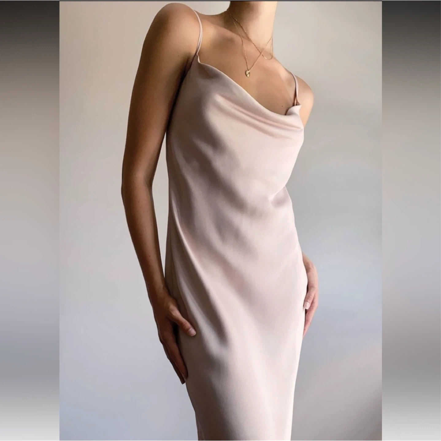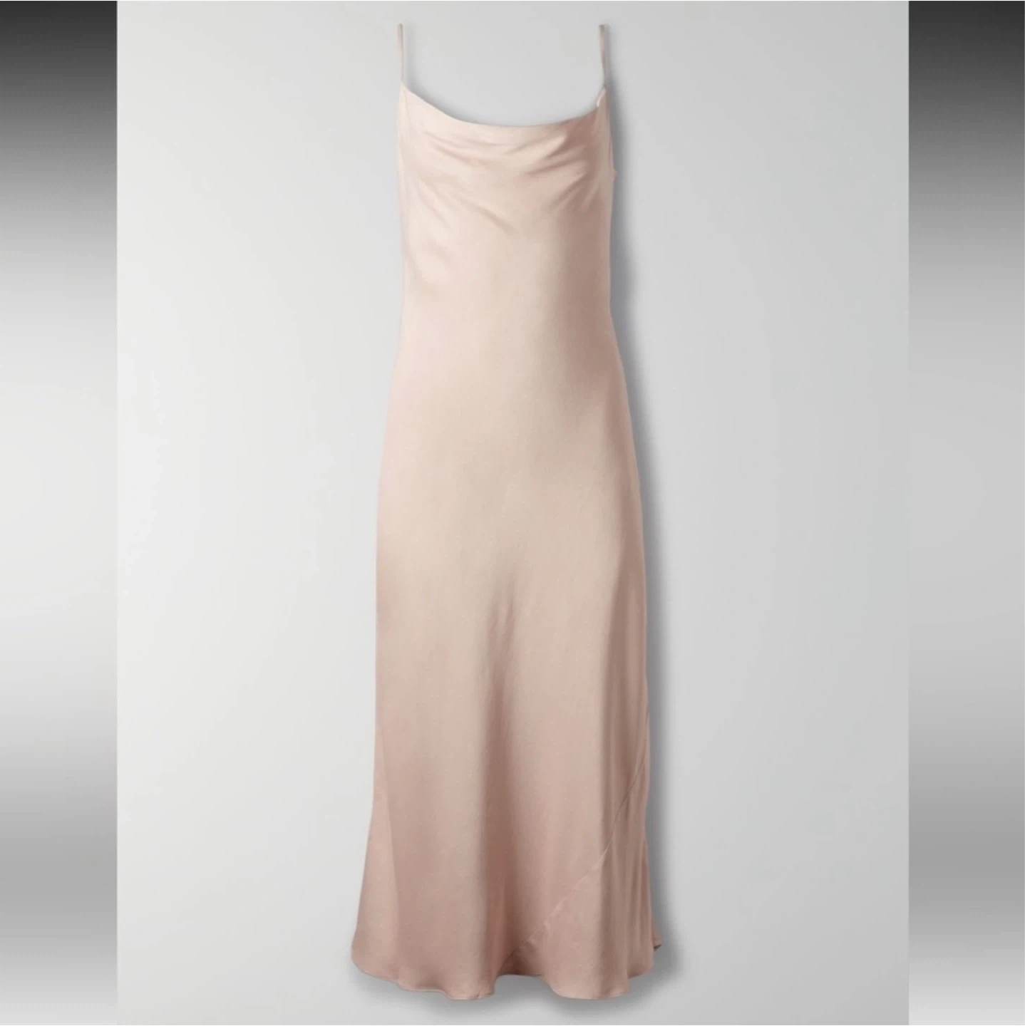This satin dress with cowl neck and adjustable straps beautifully drapes around the body. So classy!