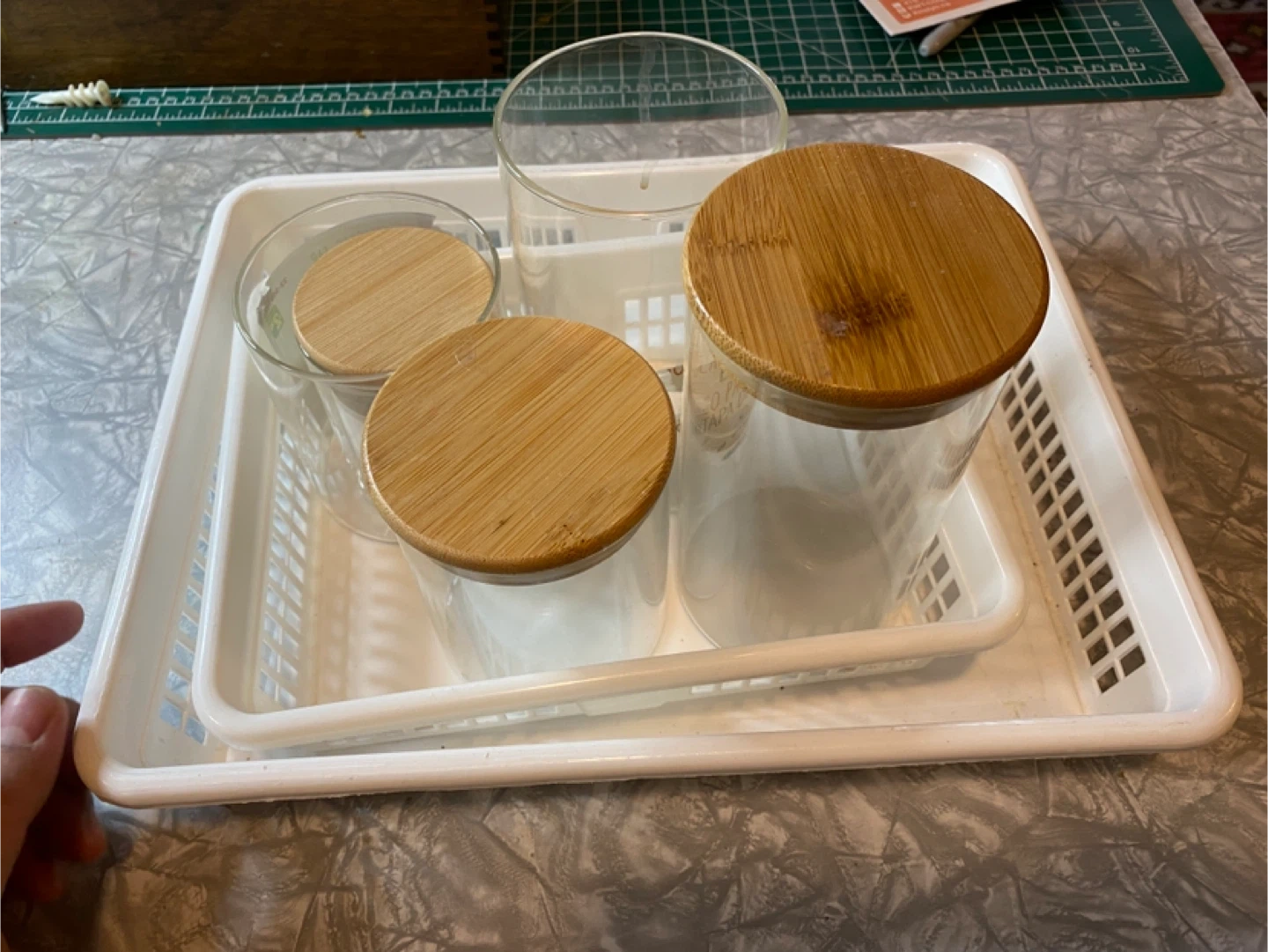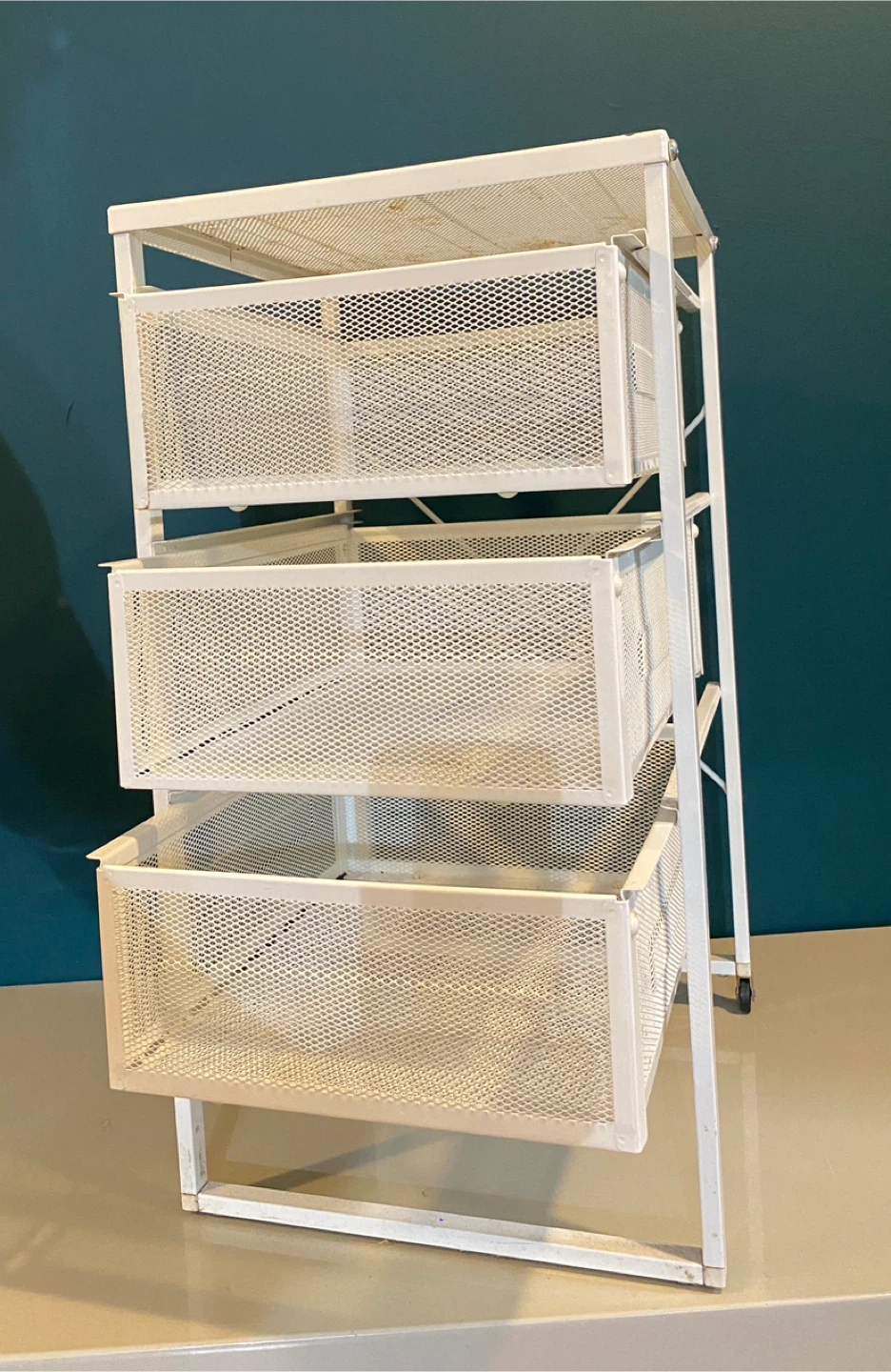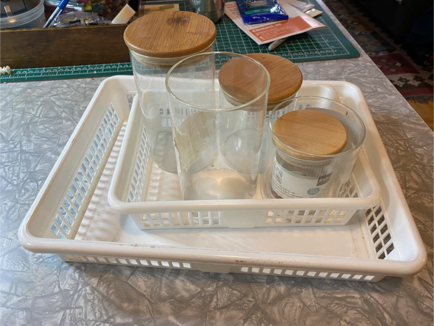 Selling Arts and Craft items, glass jars with bamboo lids, plastic baskets and an IKEA (Lennart) white metal mesh organizer.